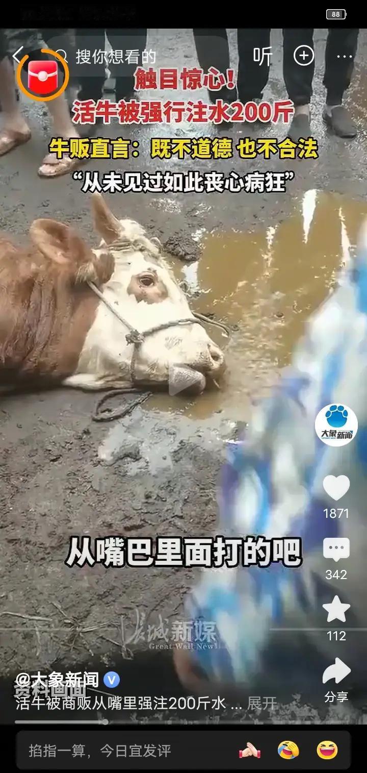 这牛贩子怕是没想到水能这么多。 一头牛被灌进两百斤水,站都站不稳,从嘴里不断往外吐。以前听说灌水增重,最多几十斤,这次实在过分。 动物不会说话,但痛苦是真实的。这种行为不仅让牛受罪,注水肉还存在安全隐患。市场需要更严格的监管,杜绝这种恶劣行为。 追求利润不能没有底线。对待动物的方式,往往反映出从业者的基本良知。