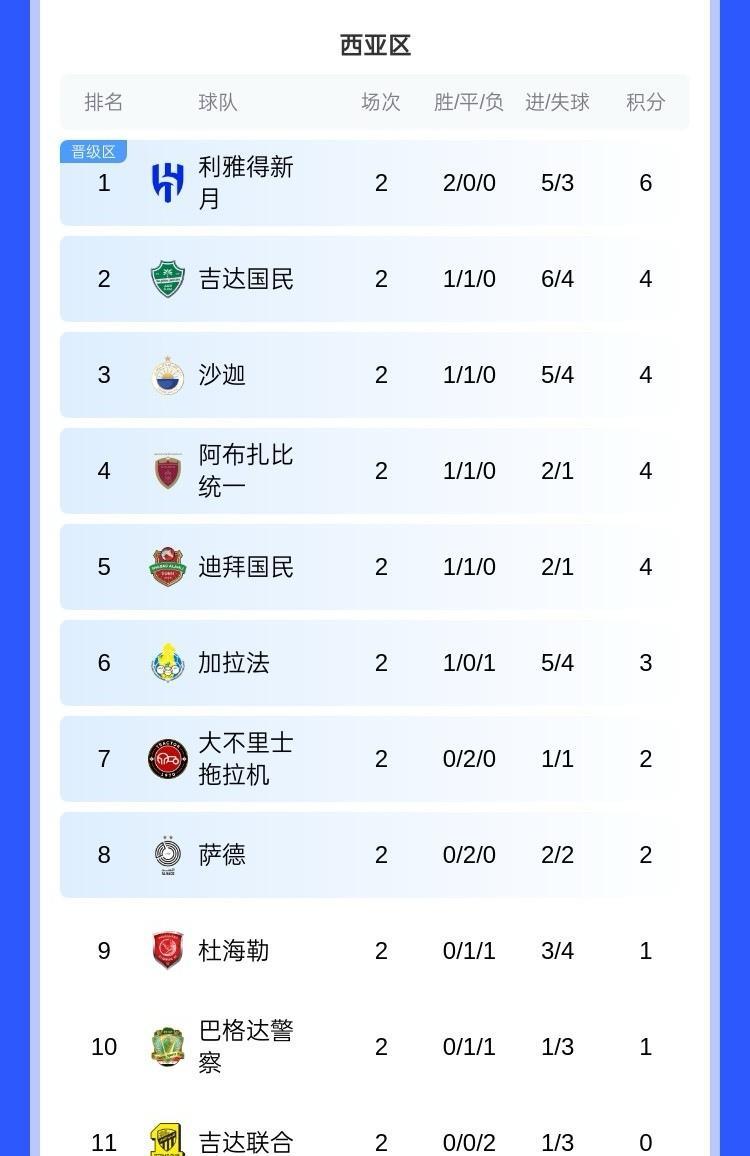 沙特三强、首尾呼应 亚冠精英联赛西亚赛区第二轮战罢,来自沙特联的利雅得新月两连胜领跑积分榜,而另一支沙特球队吉达联合两连败排名倒数,来看具体赛果和排名! 利雅得新月3-2力克纳萨夫之后,成为西亚赛区唯一一支两连胜的球队,目前排名榜首,而卫冕冠军吉达国民2-2战平杜海勒后以一胜一平排名次席,来自阿联酋三支球队沙迦、阿布扎比统一、迪拜国民同样以一胜一平的战绩排名三、四、五名! 西亚赛区目前仅有的两支两连败、一分未得的球队是来自沙特联的吉达联合、乌兹别克斯坦的纳萨夫,前者因净胜球优势排名倒数第二! 吉达联合近期各项赛事遭遇两连败,在沙特联输给利雅得胜利后,球队主教练布兰科黯然下课,不过布兰科的带队成绩不错,46场比赛取得35胜5平6负!