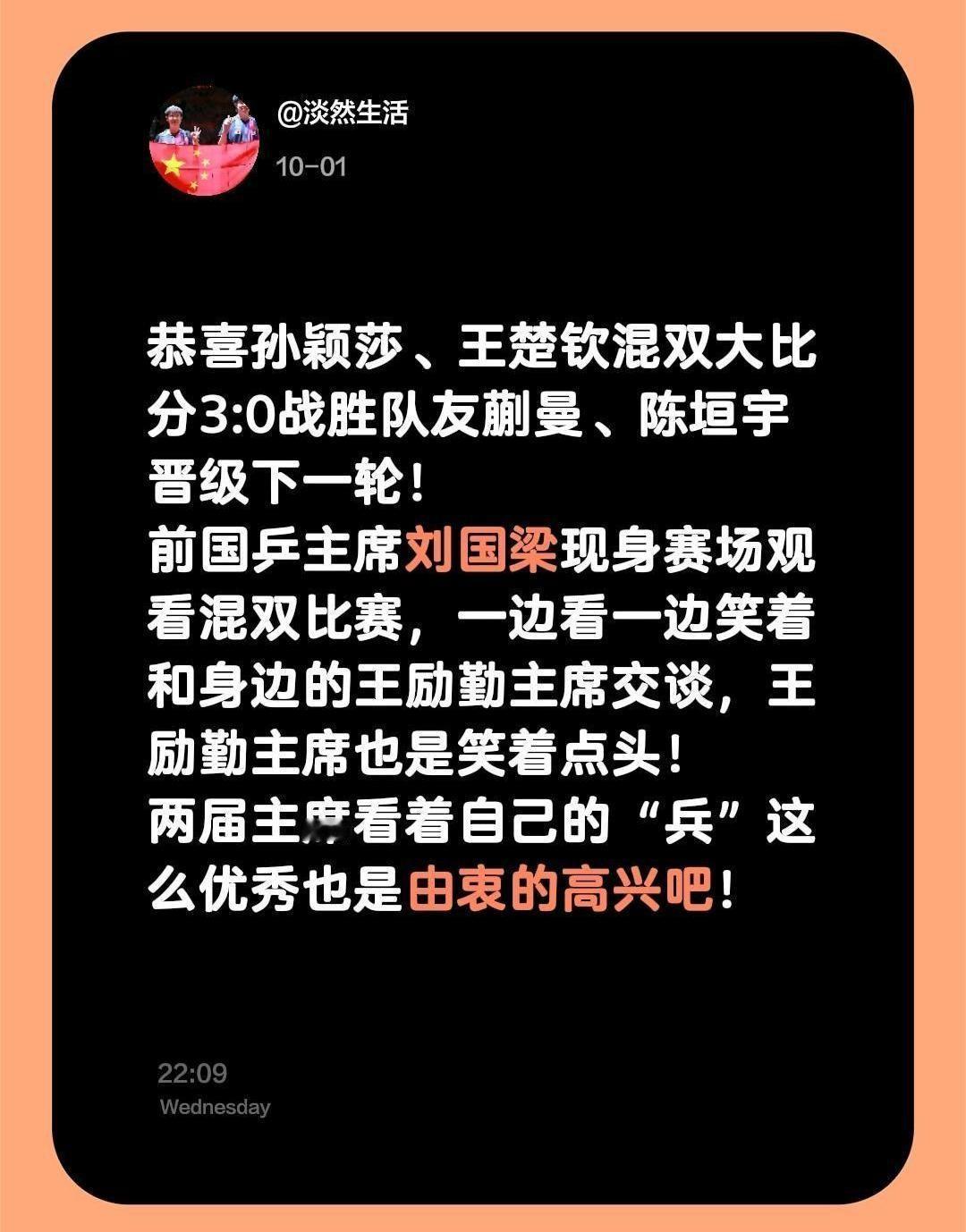 WTT沙特大满贯赛,孙颖莎王楚钦对上了自家的师弟师妹蒯曼陈垣宇。 看台上,刘国梁和王励勤并排坐着,脸上挂着藏不住的笑意。 这哪里是在看一场紧张的淘汰赛,分明是在悠闲地检阅自家的练兵成果。 比赛结果是3:0,莎头组合赢得干净利落,几乎没给年轻的对手留下任何喘息的空间。这场胜利不只是为了晋级,更是为了巴黎奥运会的一次重要实战演练,他们最终也确实拿下了沙特站的冠军,巩固了2000点的世界排名积分。 刘国梁那个笑容,其实包含了两层意思。第一层,是对莎头组合的放心,作为奥运冲金的核心力量,他们的状态稳定,这比什么都重要。第二层,是对蒯曼陈垣宇这些年轻人的欣慰,他们已经有能力在大满贯赛场上给世界第一制造压力,说明国乒的人才梯队建设非常成功。 这种“幸福的烦恼”,就是国乒强大的根源。 内部竞争打得越激烈,对外作战时就越有底气。 这场看似普通的内战,其实就是国乒在巴黎奥运前,向所有人亮出的一张王牌。