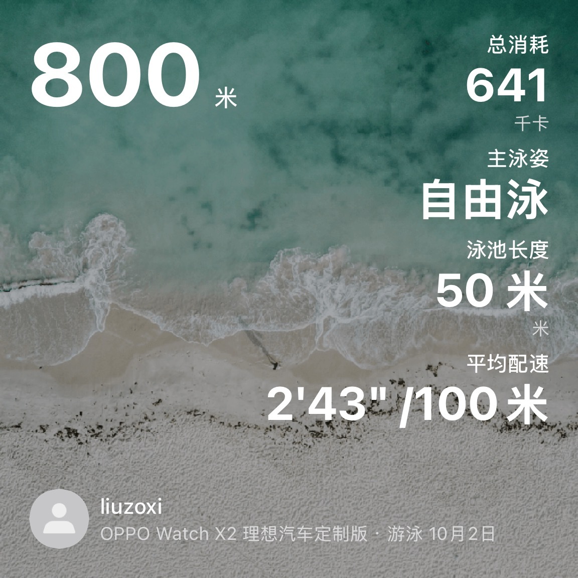 今天目标1000m,游崩了,只游了800m,继续加油,总目标配速两分内[加油