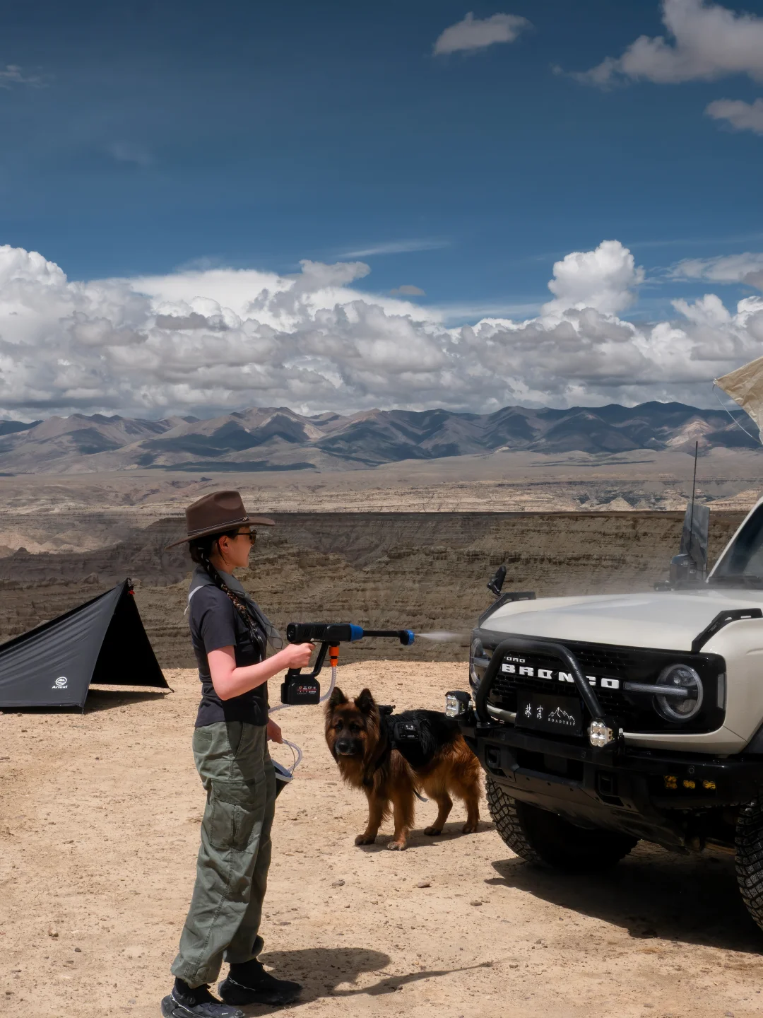 另外还带了便携洗车机方便随时冲洗车和露营装备。
