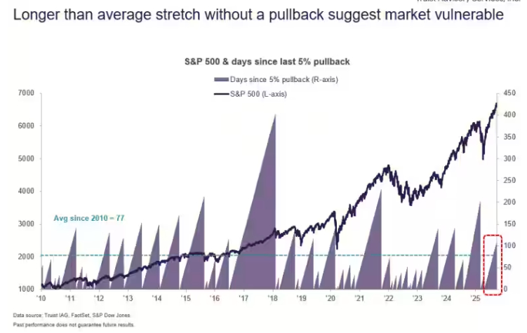 标普500指数已经连续超过100个交易日没有出现5%的回调,而长期平均值是77个交易日。当然,市场处于相对平稳状态的时期可能持续很久,过去也确实发生过。例如,最近一次类似的情况是在2018年,当时股市曾连续超过400个交易日没有出现大幅回调,直到那一轮行情结束。今年4月那一波也是如此,当时特朗普宣布“解放日”关税政策,导致市场急剧下跌。
