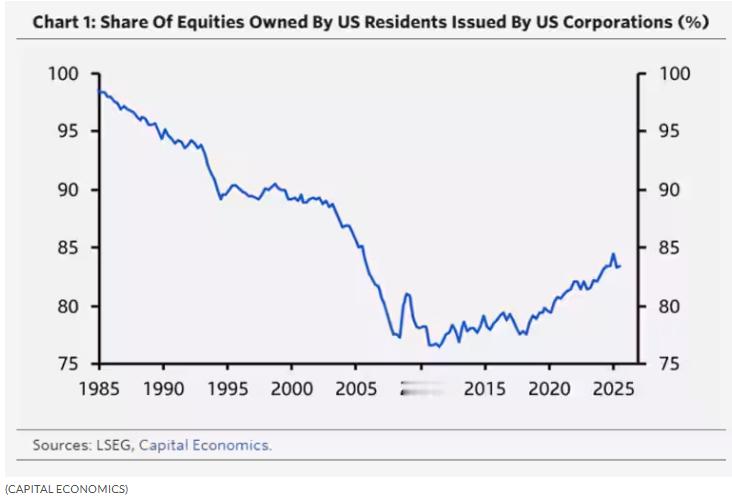尽管美国投资者净买入的外国公司股票数量超过了美国公司股票,但他们对美股的敞口依然持续上升。这主要是因为美股涨势强劲,而且美股本身在投资组合中占比就很高。此外,直到今年以前,美股自金融危机以来大多表现优于其他市场。
