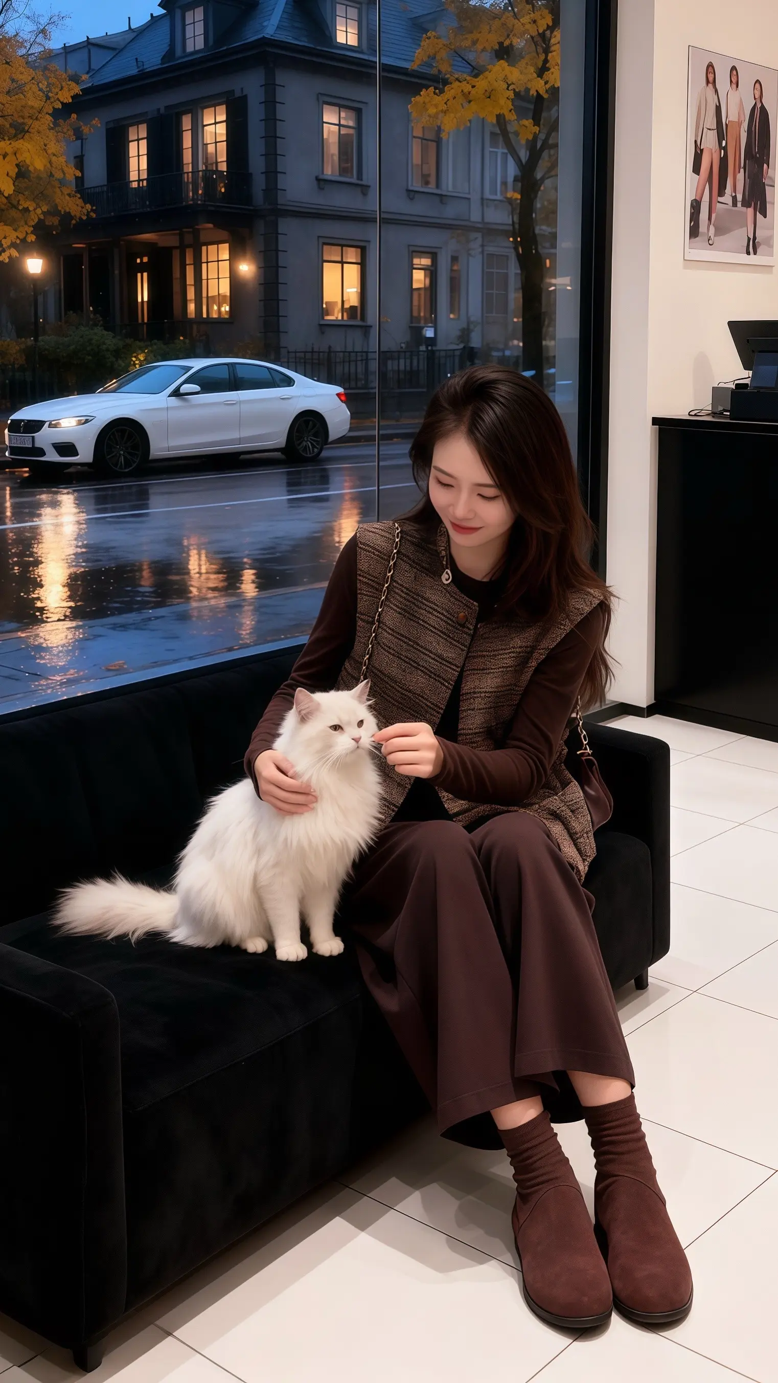 在傍晚的服装店,我被这套棕系穿搭和窗边的白猫同时击中了心。入手这件马甲后,发现它远比想象中更有“温度”。