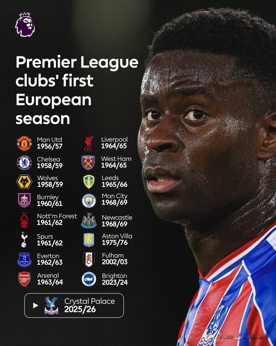 图片展示了英超俱乐部首次参加欧洲赛事的赛季: • 曼联和利物浦分别在1956/57赛季和1964/65赛季首次参加欧洲赛事。 • 埃弗顿和富勒姆分别在1962/63赛季和2002/03赛季首次参加欧洲赛事。 • 阿森纳在1963/64赛季首次参加欧洲赛事,而布莱顿则在2023/24赛季首次参加。 • 水晶宫在2025/26赛季首次参加欧洲赛事。 • 切尔西、西汉姆、狼队、利兹联、伯恩利、曼城、诺丁汉森林、纽卡斯尔、热刺和阿斯顿维拉等俱乐部也列出了他们首次参加欧洲赛事的赛季。