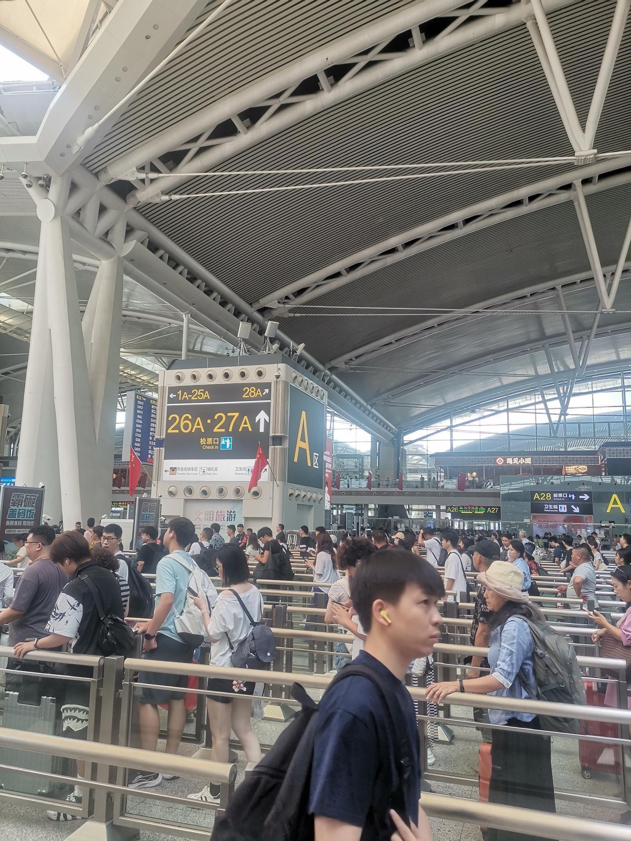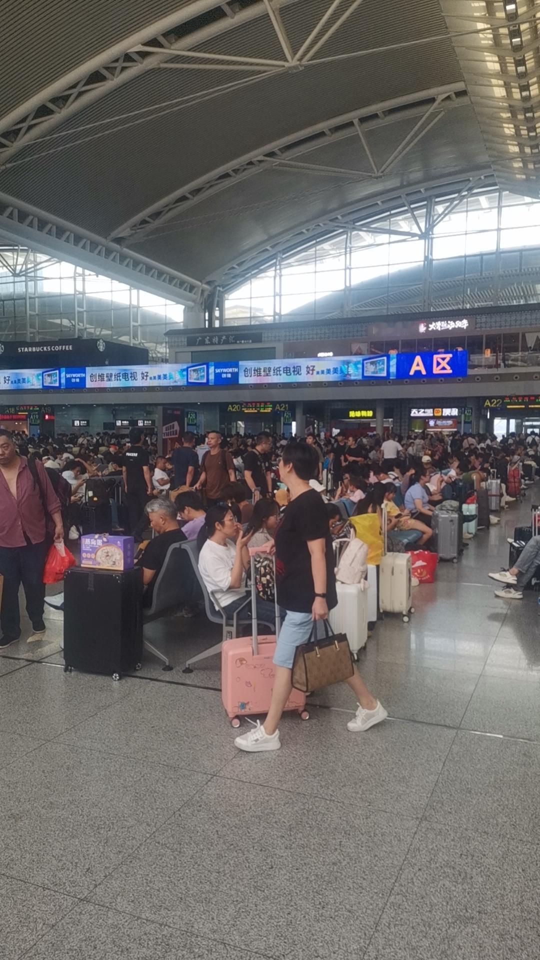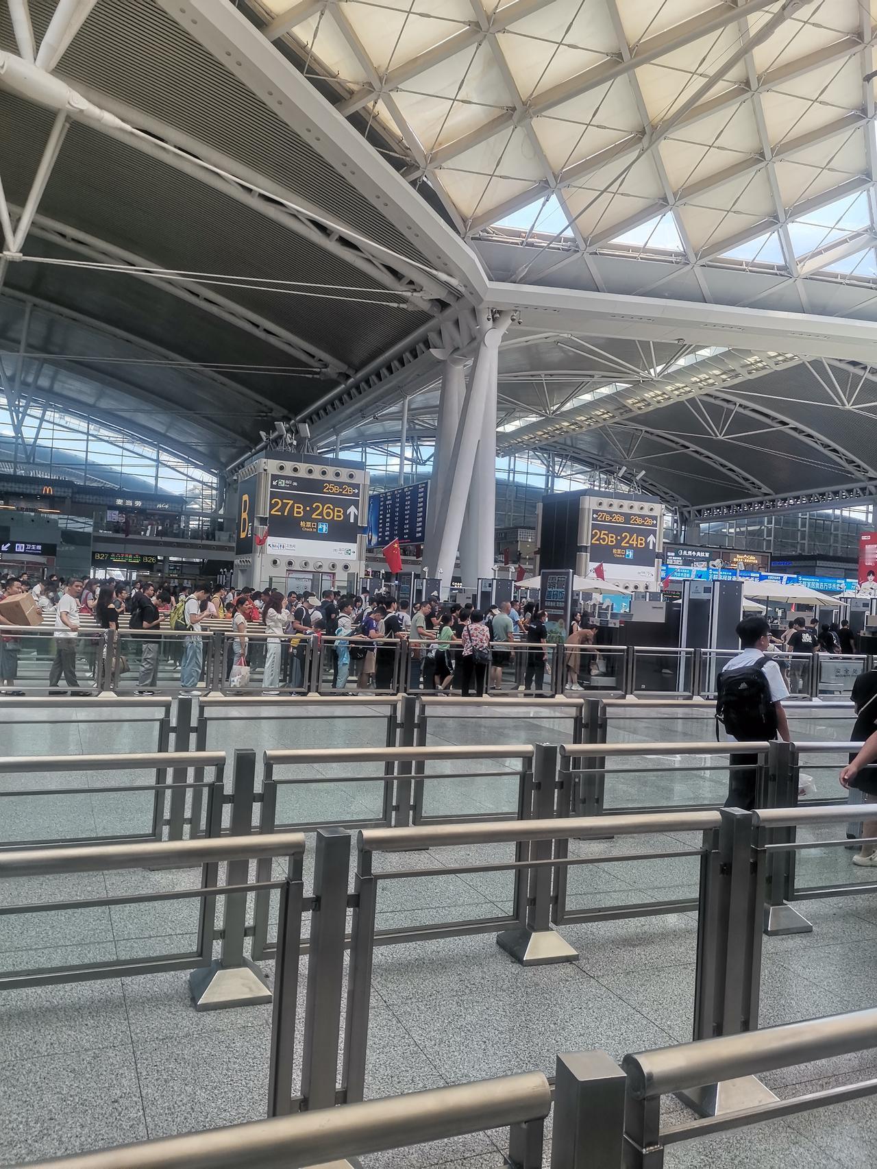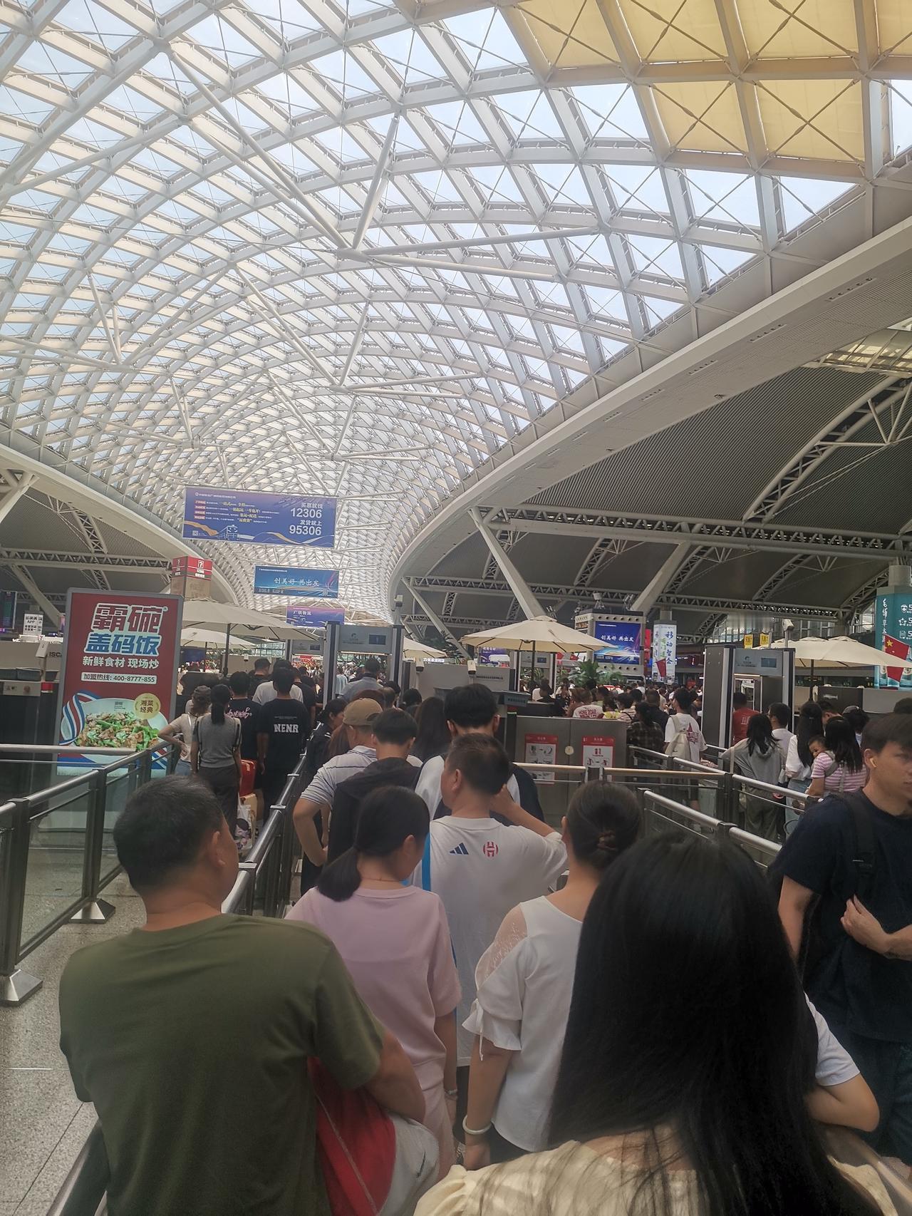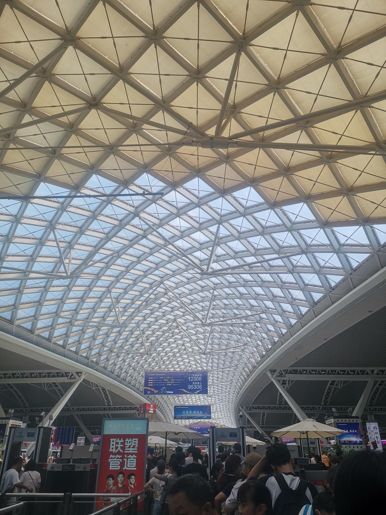 10月3号的广州南站, 依然是人山人海,来来往往, 过安检一样要排长龙, 这个国庆中秋真的没有所谓的错峰出行啊! 高速,地铁,高铁,飞机场全部都是人啊。 话说广州南站这个三楼的楼顶部采光是不错,但真的是热的要命啊! 坐着等车都汗流浃背啊!广州南站
