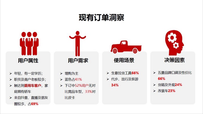 事实上五菱预判的市场机会和现有订单的人群就已经产生明显差异。从现有订单洞察,可以判断至少有70%的用户来自于他自己的基盘,有30%来自其他方面。更何况,五菱1月份的微卡市占率减少20%,减少了近8000台销量,这也侧面证明皮卡销量来自于他自身的基盘。