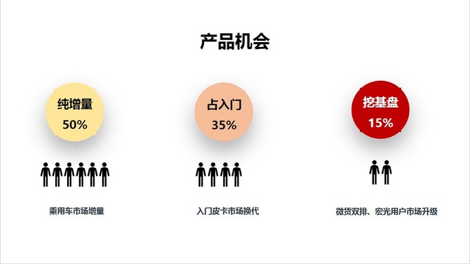 五菱是一家有影响力,有渠道,有销量的明星企业,但是目前对于皮卡行业的认识还明显缺乏专业性和前瞻性。五菱在沟通会上说,他们认为五菱征途这款车的市场机会有50%在于乘用车纯增量,35%在于入门皮卡市场换代,15%在于挖基盘。