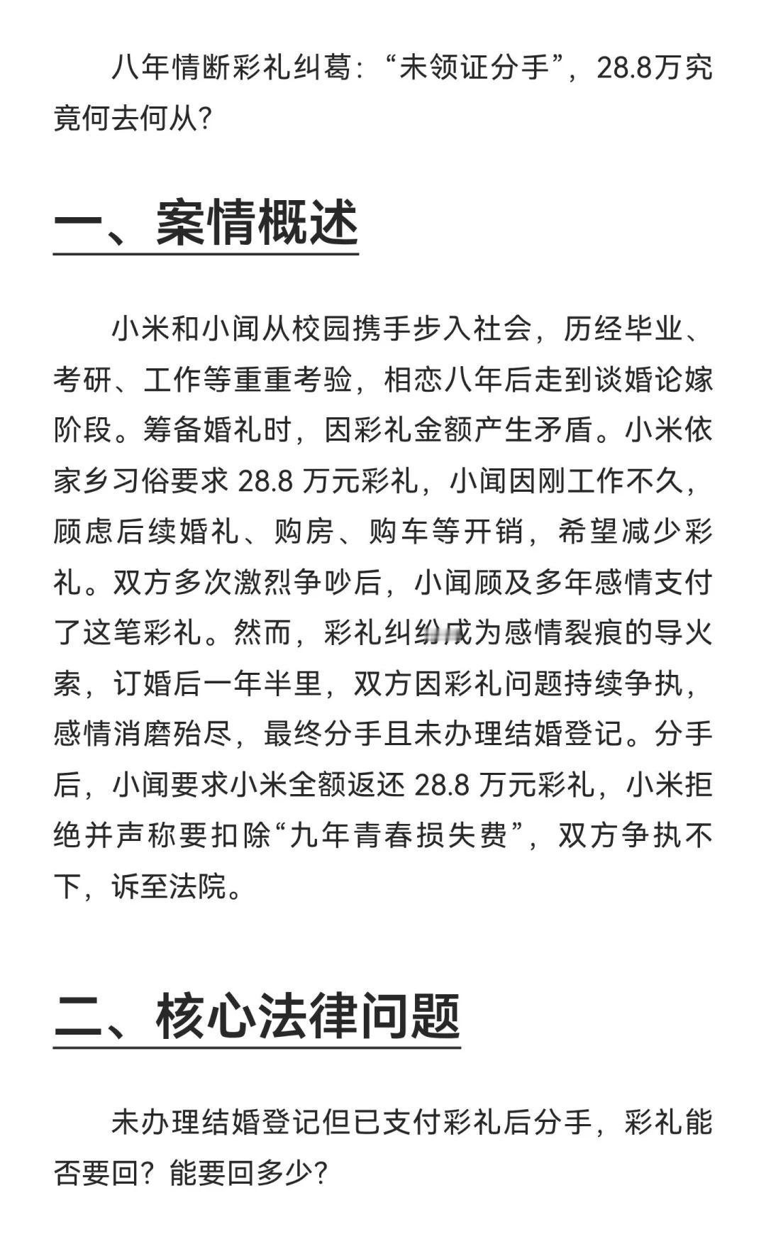 八年情断彩礼纠葛:“未领证分手”,28.8万 未办理结婚登记但支付彩礼后分手,彩