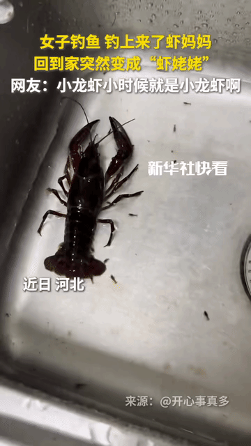 “开心一刻”河北,一女孩去钓鱼抓到了3只小龙虾,当时看到网兜有东西以为是虫子没在