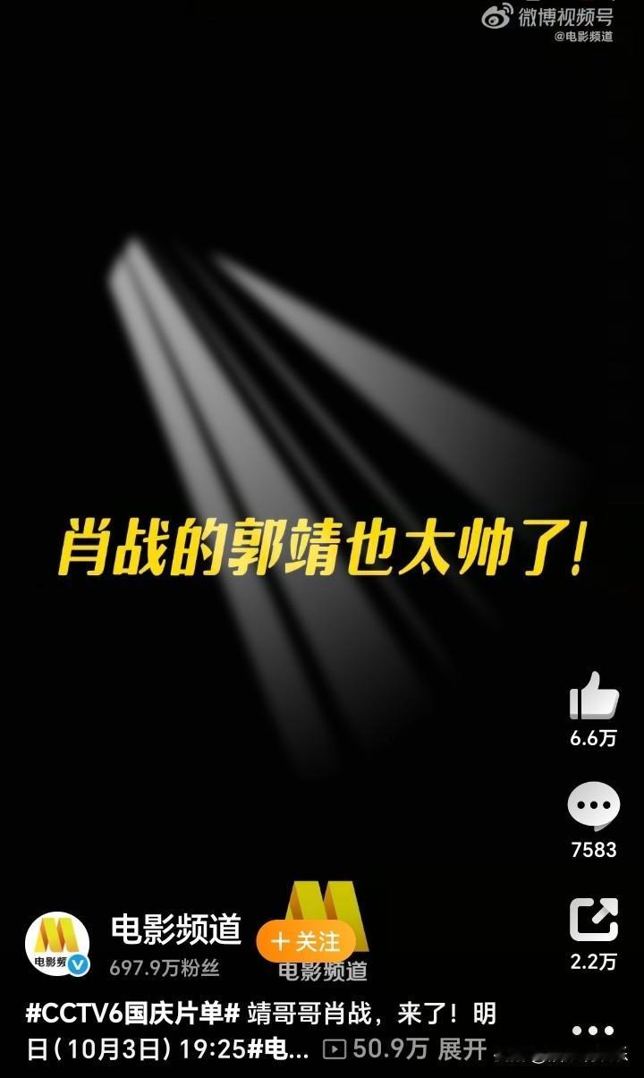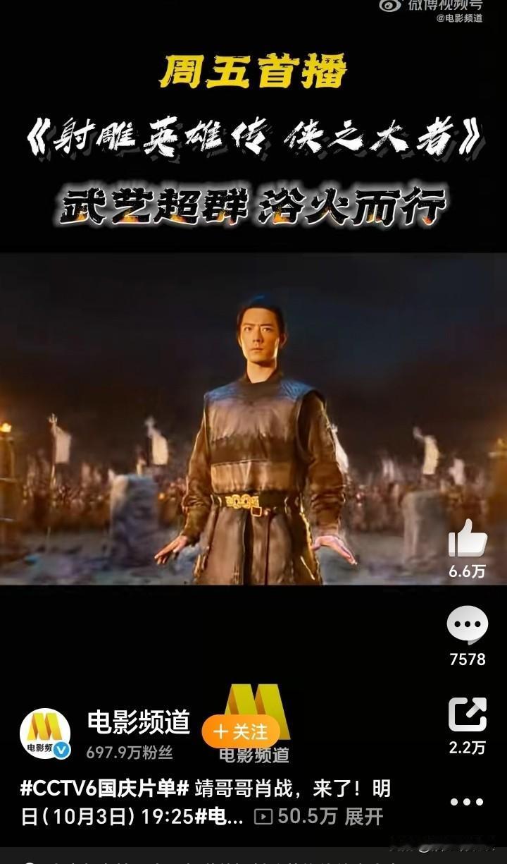 快讯!肖战版“靖哥哥”今晚登陆六公主!《射雕英雄传:侠之大者》CCTV6首播今晚19:25黄金时间,电影频道(CCTV-6)将电视首播《射雕英雄传:侠之大者》。肖战饰演的郭靖“靖哥哥”,以武艺超群的江湖侠者形象登场,在火光漫天的场景中展现凌厉打戏,尽显武侠风范。作为CCTV6国庆片单 重磅内容,这部影片聚焦作品值得武侠迷锁定收看。六公主国庆播肖战版射雕