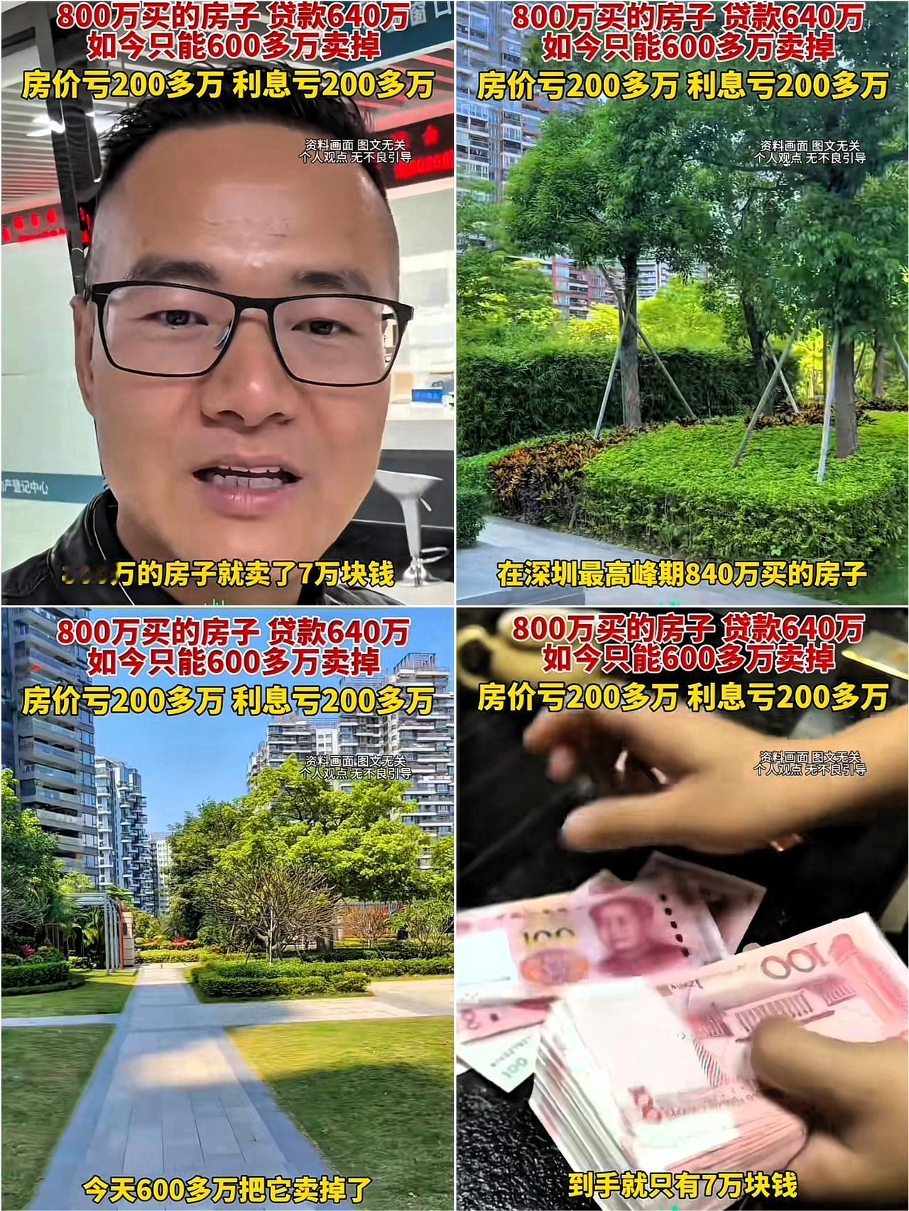 深圳的这位男子也太惨了!在房价最贵时,花了800万买房,贷款640万,现在只能卖600多万,房价亏200多万,利息又亏200多万,一共亏400多万,最后到手才几万,真是哭着,笑着走出来,一把辛酸泪心里苦哇。 这事儿哪是他运气差啊,是很多人都被“买房必赚”的老思想坑了。以前总觉得房子是硬通货,哪怕贷款也要冲,可现在才明白,房产早不是稳赚的买卖了。 你看那用经营贷买房的、抵押房产周转的,一旦房价跌了,银行就会追着要补差额,分分钟让你陷入绝境。房子本是用来住的,别把它当成赌桌,赌赢了是运气,赌输了可能就是一辈子的积蓄。