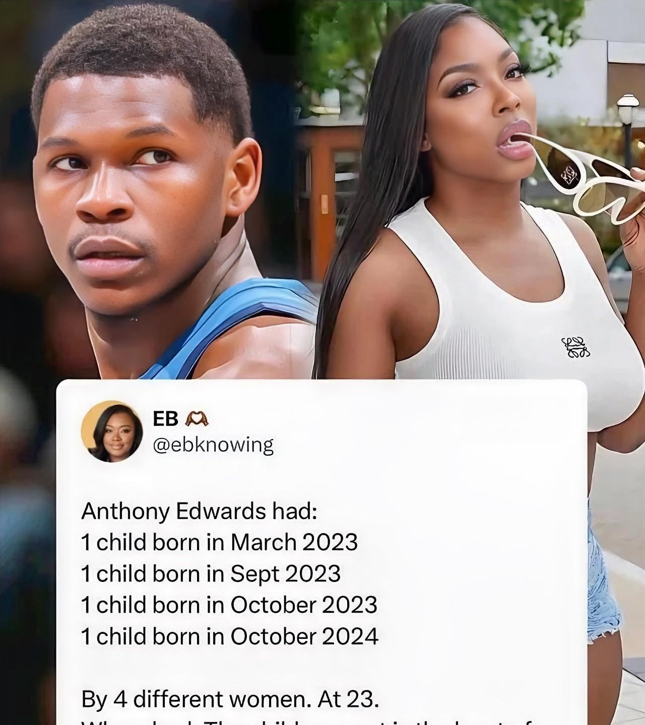近日,关于爱德华兹的私人生活在社交媒体上引发了热议。美媒调侃他才是NBA的真正“射手”——不仅因为他在场上展现出色的得分能力,还因他在生活中“精准投篮”的表现。 根据曝光的信息,安东尼·爱德华兹在23岁时,已经迎来了四个孩子,分别出生于: 2023年3月:第一个孩子 2023年9月:第二个孩子 2023年10月:第三个孩子 2024年10月:第四个孩子 这些孩子来自四位不同的女性。这一切都让人忍俊不禁,尤其是与他在球场上的“射手”身份相呼应。这种私人生活的“得分记录”可能超出了大多数人能想象的范围,但这也从另一个角度展示了他的“精准投篮”,成为网络上的笑谈。 这种玩笑虽然有些夸张,但也反映了公众对明星运动员的私人生活充满关注,尤其是那些在场上场下都让人瞩目的人物。 #爱德华兹#