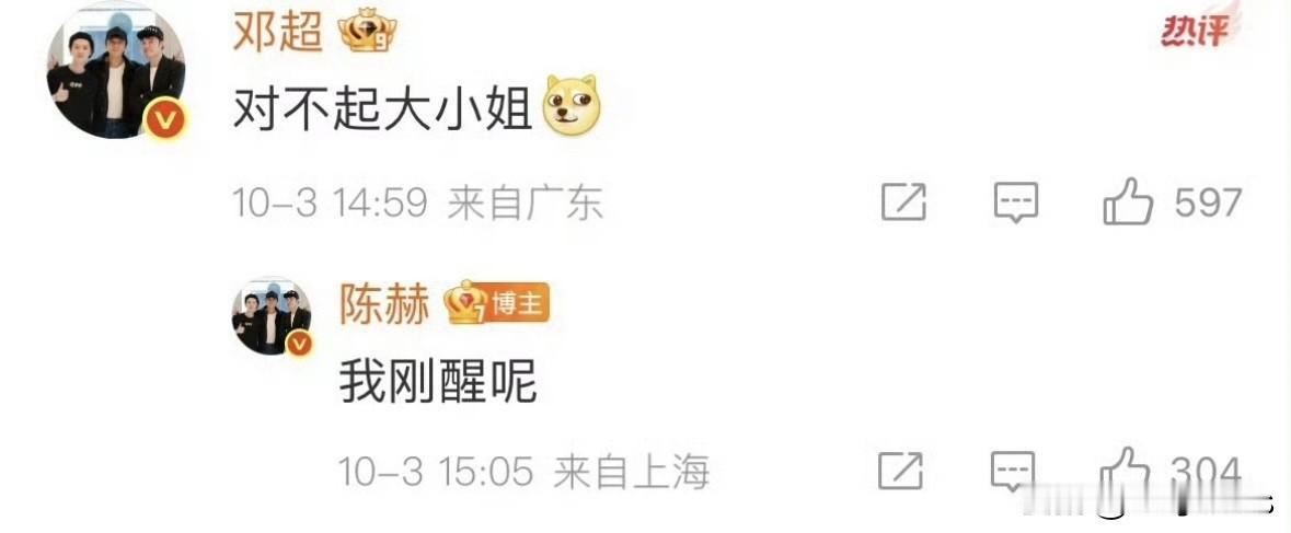 邓超喊陈赫大小姐耶 大小姐,哈哈哈哈哈,一个敢叫一个敢应 “对不起,大小姐”,感觉超哥赫哥你俩多少有点暧昧了吧。 快点更新五哈,下饭神器 邓超