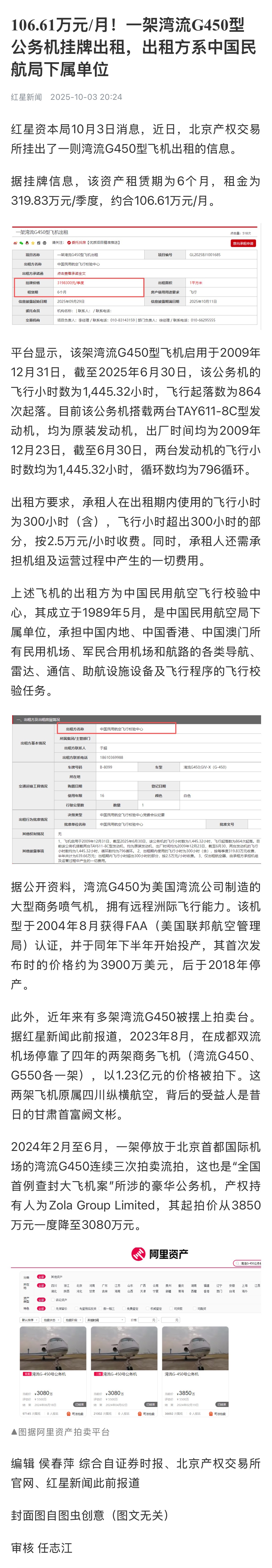 【106.61万元/月!#一架湾流G450型公务机挂牌出租#,出租方系中国民航局下属单位】#湾流G450型公务机月租106万余元# 红星资本局10月3日消息,近日,北京产权交易所挂出了一则湾流G450型飞机出租的信息。据挂牌信息,该资产租赁期为6个月,租金为319.83万元/季度,约合106.61万元/月。出租方要求,承租人在出租期内使用的飞行小时为300小时(含),飞行小时超出300小时的部分,按2.5万元/小时收费。同时,承租人还需承担机组及运营过程中产生的一切费用。