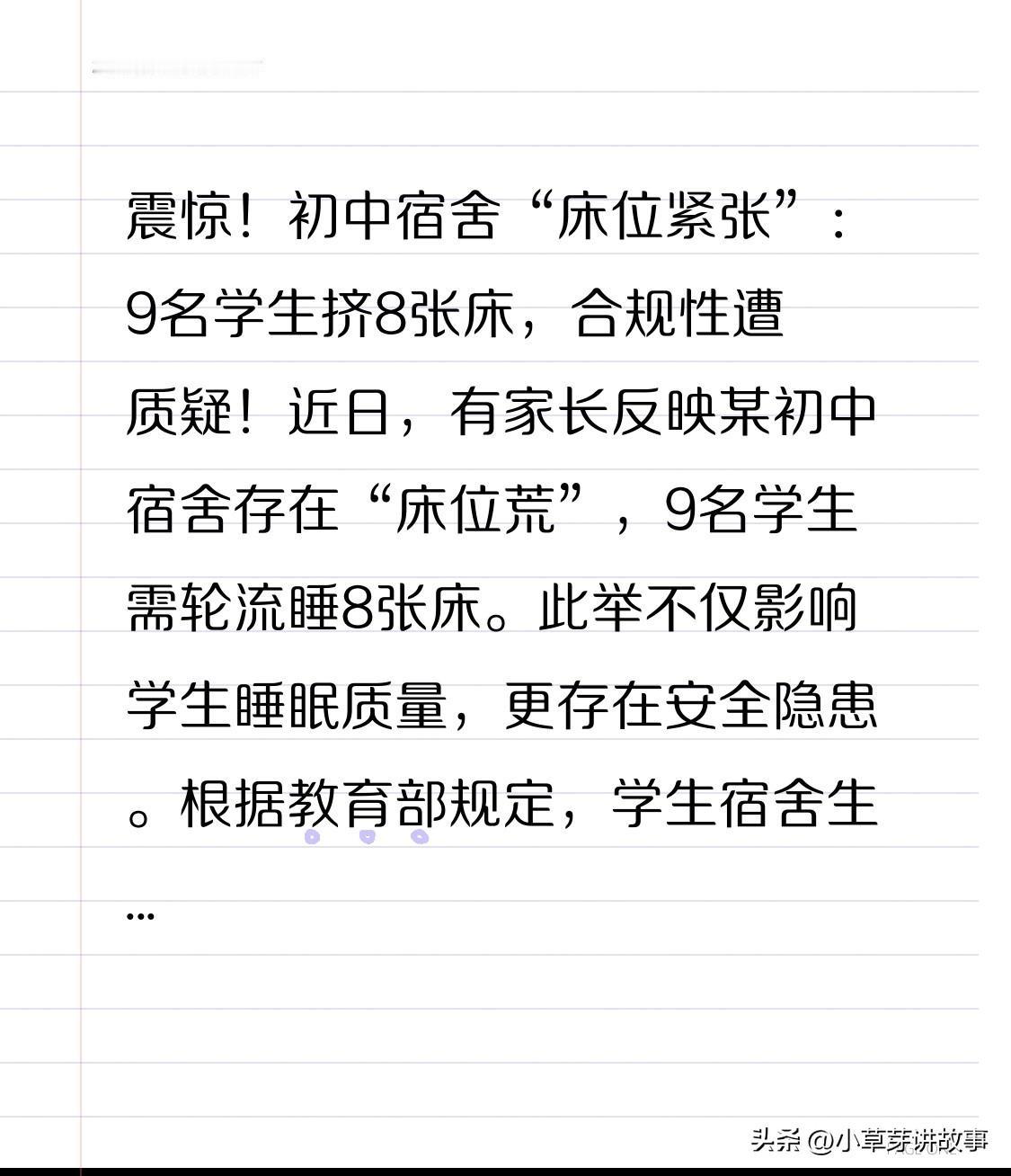 惊爆!初中宿舍“床位紧张”:9 生挤 8 床,合规性引质疑! 近日,有家长反映某初中宿舍“床位荒”,9 名学生要轮流睡 8 张床。这既影响学生睡眠,又有安全隐患。教育部规定,学生宿舍生均面积不小于 3㎡,每间住人不超 12 人。该校明显违规,虽称“临时安排”,却暴露管理问题。应加强监管,保障学生住宿权益!