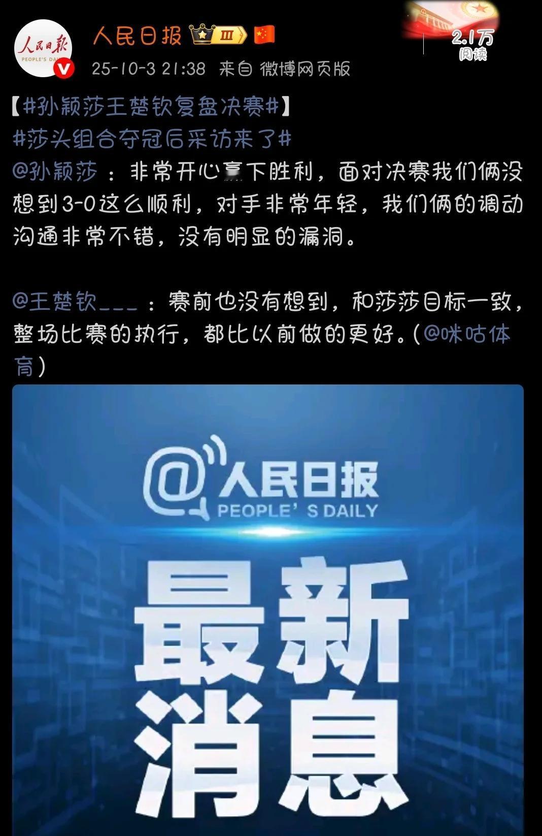 昨晚王楚钦孙颖莎混双夺冠后, 各家媒体都在转发祝贺, 人民日报的最惊人啊, 第一时间发出来他们赛后说的话。 主要是他这个版面, 乍一看还以为是“重大消息”, 仔细一看是“最新消息”。 不过看孙颖莎/王楚钦打混双有种很说不出来的霸气感觉, 世界第一的组合, 即使不练球也能给人心定的。