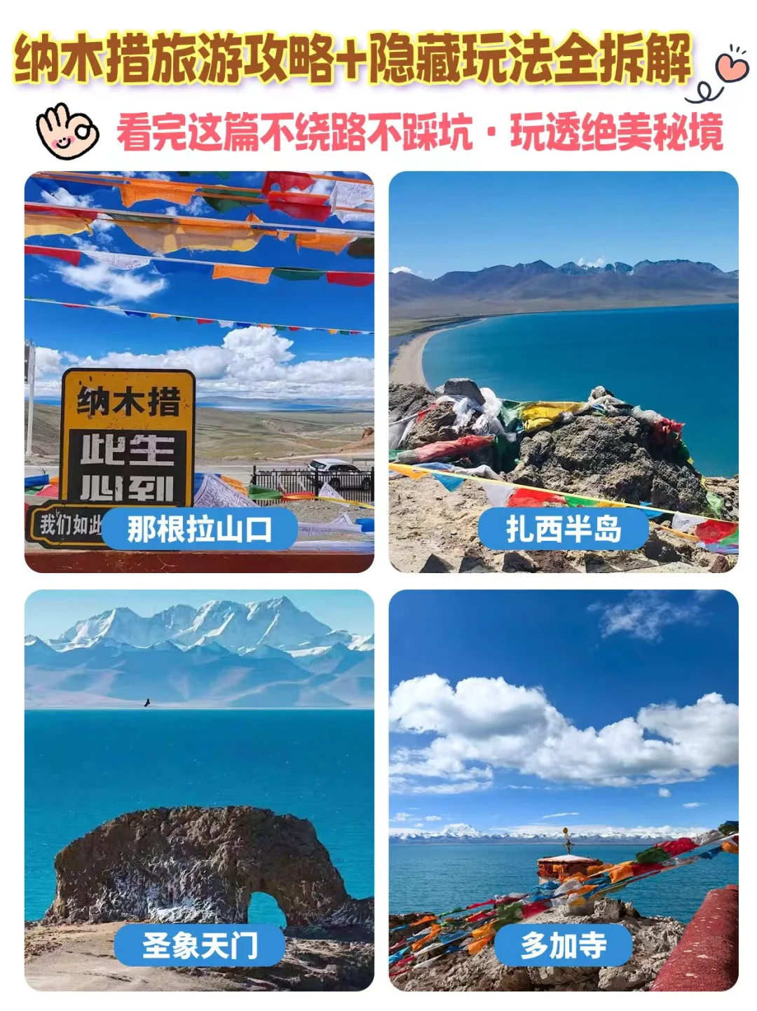 在扎西半岛可环湖徒步,大概 2 小时,能发现不一样的美景,📸往半岛深处走,有个小山坡,在那能俯瞰整个半岛和湖湾,以经幡为前景拍照超有感觉;从圣象天门沿着湖边向右走,有一处岩石堆,站在上面以圣象天门和湖为背景,拍出来的照片超赞。圣象天门除了打卡石拱门,周边的月牙湾、三生石也超美,不要错过。