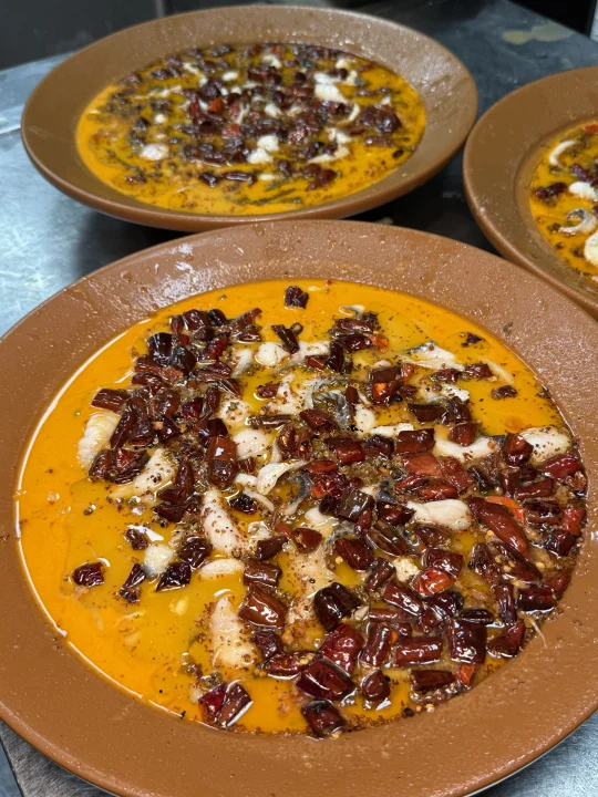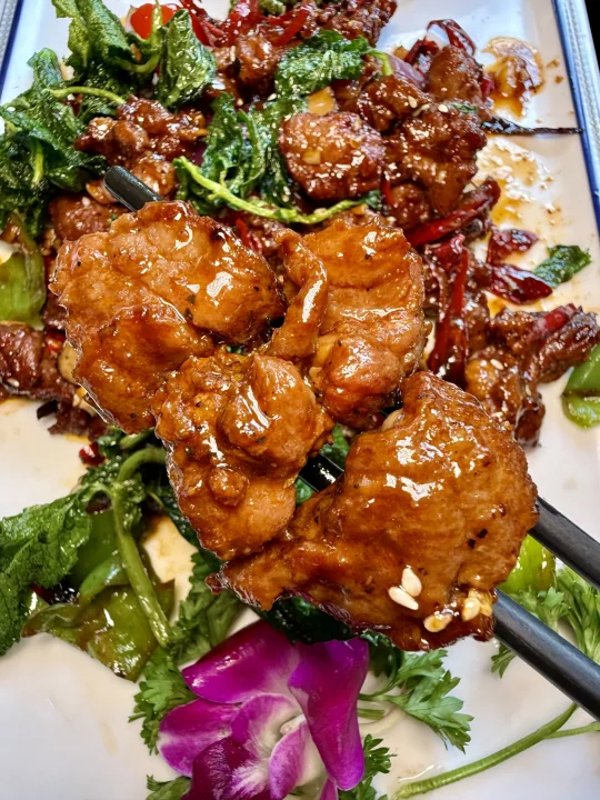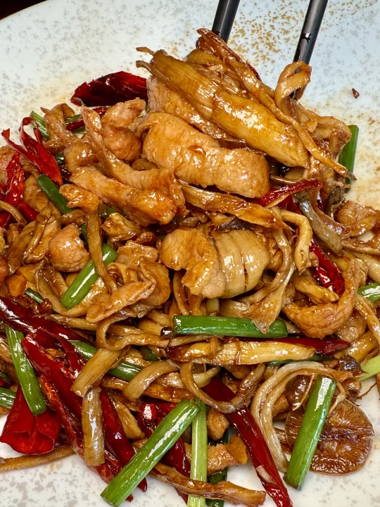 高原特色双椒鸡:鸡肉吃起来很香很嫩,里面的饵块糯糯的,青红双椒混合但也不会很辣,现炒出锅的,特别有锅气!
