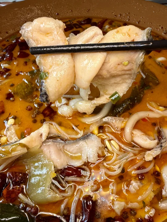 香巴拉酸汤鱼:酸酸辣辣的很开胃,汤汁鲜美,鱼肉鲜嫩,还有木耳,豆芽,土豆粉~份量很足