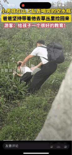 去把那个瓶子捡回来! 浙江,一对父子在山上游玩,儿子喝完瓶子里的水,顺手就把空瓶子扔进草丛里。爸爸看到了,坚持带着他去地空瓶子捡回来。小孩不愿意,有抵触情绪,一直在哭。但爸爸仍然坚持,并且牵着他的手,拽着他把瓶子捡了回来。 视频中,爸爸一只手紧紧地握住孩子的手,另一手也护住孩子。孩子一边捡一边哭着。能看出来爸爸真的很在乎孩子的安全。 这位爸爸也可以自己把瓶子捡回来,但他没有这么做,而是教育孩子:自己做的错事要自己改正,我们从小就被教要德智体美劳全面发展,德育排在。 德是德行,是为人处事的态度。勿以善小而不为,勿以恶小而为之。捡瓶子看似是小事,但是给了孩子一个良好的教育。 取材网络,侵权秒删