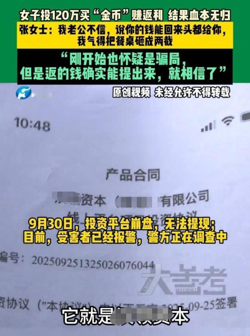 河南郑州,一女子经朋友推荐,接触了一个叫“金币”的投 资平台,她第一次投了500