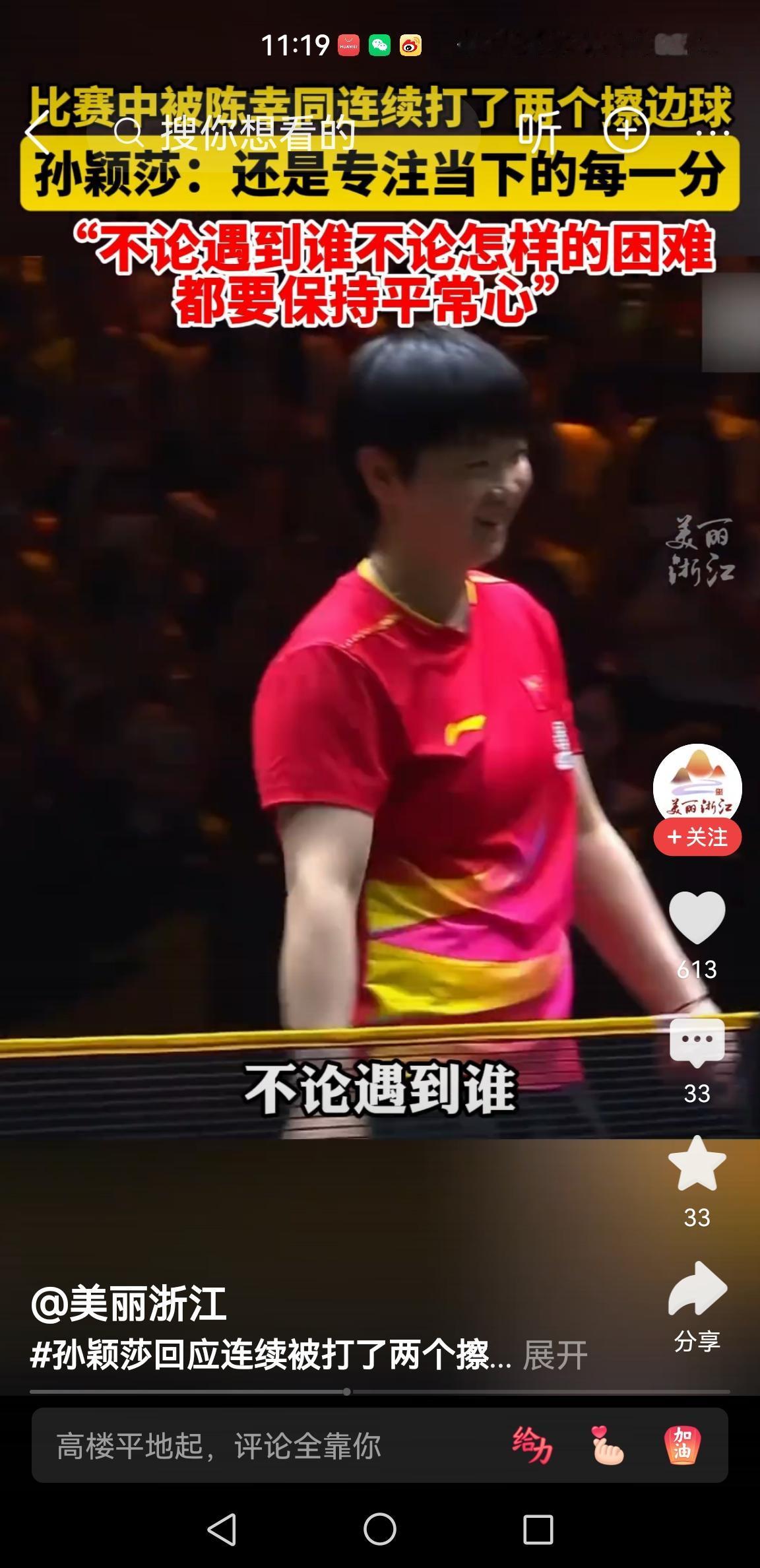 两个擦边球,把莎莎同同都整笑了 1/4决赛,孙颖莎对阵陈幸同。前五局,孙颖莎3:2领先。 最后一局莎莎10:7领先,没想到陈幸同连续两个擦边球,将比分追到10:9。 陈幸同笑了,向莎莎举手示意,不是有意的,笑容里写满歉意。 莎莎莫名其妙,有些懵圈。随即看见对面同同的表情,也笑了。 莎莎赢球后,接受记者采访,谈到擦边球,说得有水平: 无论遇到谁遇到什么困难,都要保持平常心,还是要专注每一分。 莎莎一番话,好有大将风度! 同同一个表情,折射出的是高情商! 莎莎同同,都是国乒的骄傲!都是好姑娘好孩子[赞]