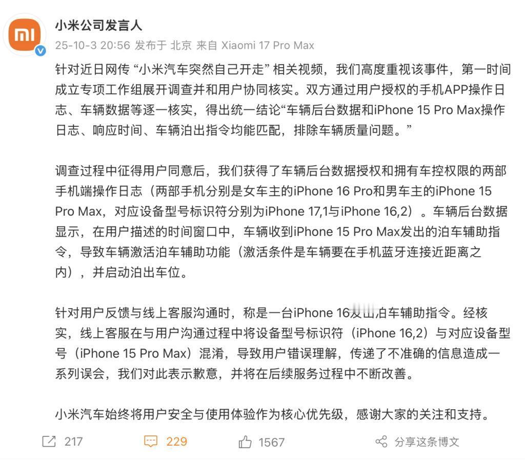 这事儿挺有意思——山东威海一位小米车主前几天发视频,说自己的车在没人的情况下自己启动开走了,把大伙都吓了一跳。 小米反应挺快,马上成立工作组调查。结果出来了:根本不是车的问题,是车主自己的iPhone 15 Pro Max手机发出了泊车指令,车才启动的。后台数据和手机操作日志完全对得上。 其实说白了,就是手机在蓝牙连接范围内不小心碰到了泊车按键。这功能本来就是方便车主远程控制车辆的,没想到闹出这么个误会。 还有个插曲挺逗——车主跟客服沟通时说用的是iPhone 16,客服就把设备型号搞混了,传递了错误信息,让误会更深了。小米也为此道了歉,承认客服需要改进。 要我说啊,现在智能汽车功能越来越多,有时候确实会出点意想不到的状况。就像这次,估计是手机放口袋里不小心误触了。好在没造成什么损失,就是个虚惊一场。 这事也给所有智能车主提了个醒:平时得多熟悉车辆的各种功能,特别是远程控制这类操作,得知道怎么正确使用,避免误操作。手机最好也别随便乱放,万一不小心碰到什么按键就麻烦了。 小米这次处理得还算到位,第一时间调查清楚,数据也透明。既然不是车辆质量问题,那大家也就放心了。不过客服的专业度确实还得再提升提升,别再闹出把手机型号搞混这种笑话了。 你们觉得呢?现在汽车越来越智能,这种“乌龙”事件以后会不会更多?