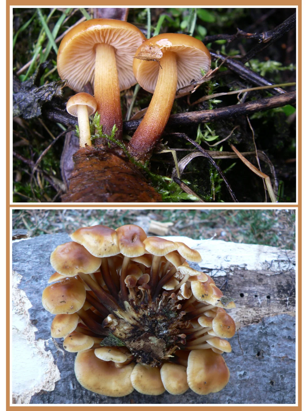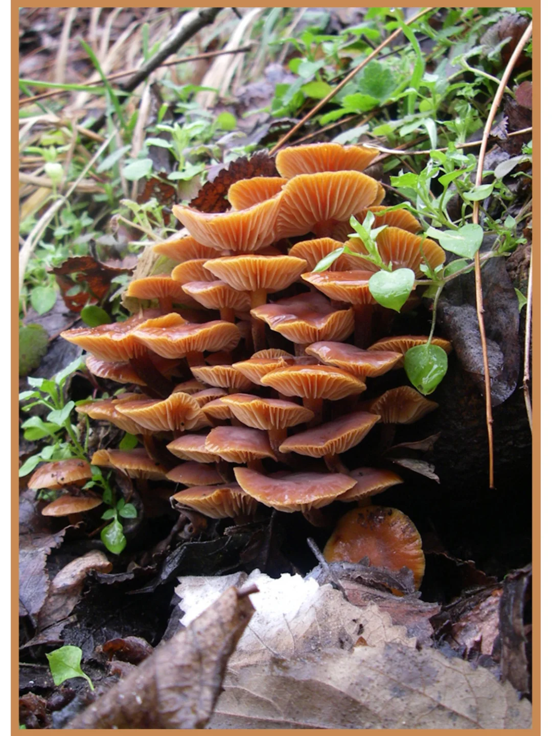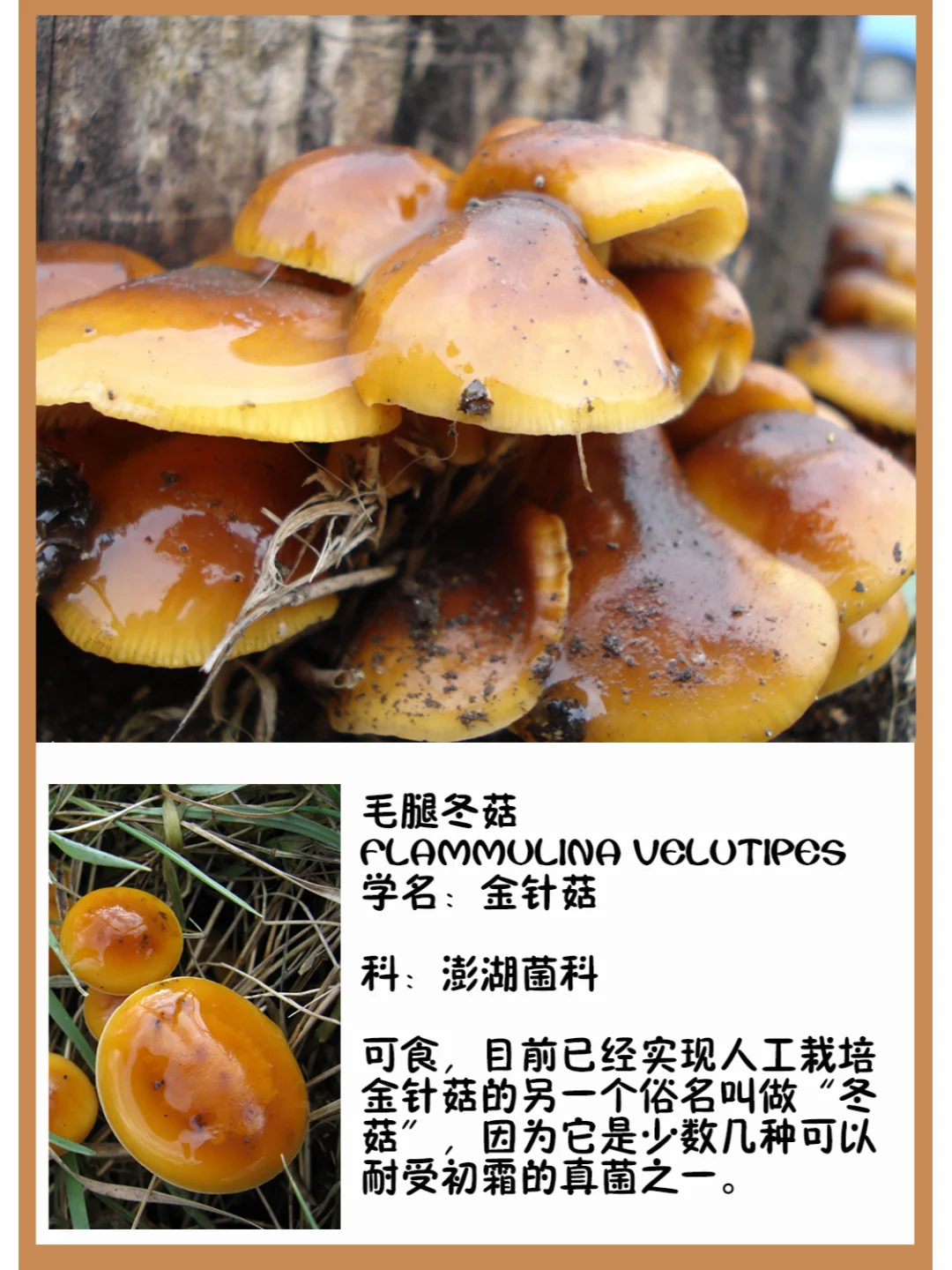 毛腿冬菇 Flammulina velutipes 学名:金针菇 科:澎湖菌科 图片©manatarka.org ©josef hlasek 可食,目前已经实现人工栽培[害羞R] 金针菇的另一个俗名叫做“冬菇”,因为它是少数几种可以耐受初霜的真菌之一。 金针菇菌柄结实,菌盖光滑,橙褐色,湿时油腻