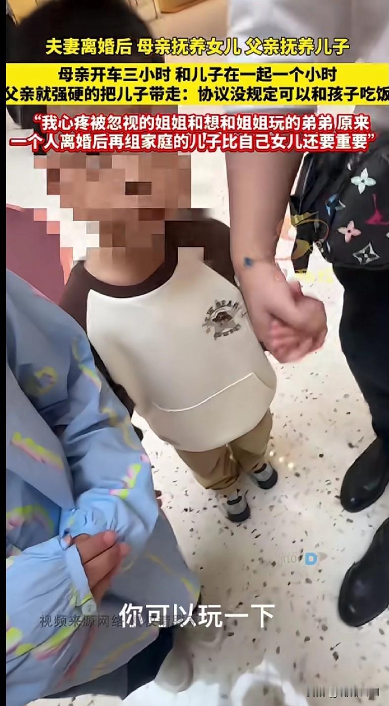 “家人们看完这个真的破防了!一对夫妻离婚后,妈妈养女儿、爸爸养儿子。妈妈开车三小时就为了和儿子待一个小时,结果爸爸一句‘协议没规定可以和孩子吃饭’就强硬把孩子带走… 最让人心疼的是姐姐和弟弟,一个被忽视,一个想和姐姐玩却没机会。离婚后再组家庭,怎么就让自己的孩子成了牺牲品呢?孩子是无辜的啊,别让大人的恩怨伤了他们的心!