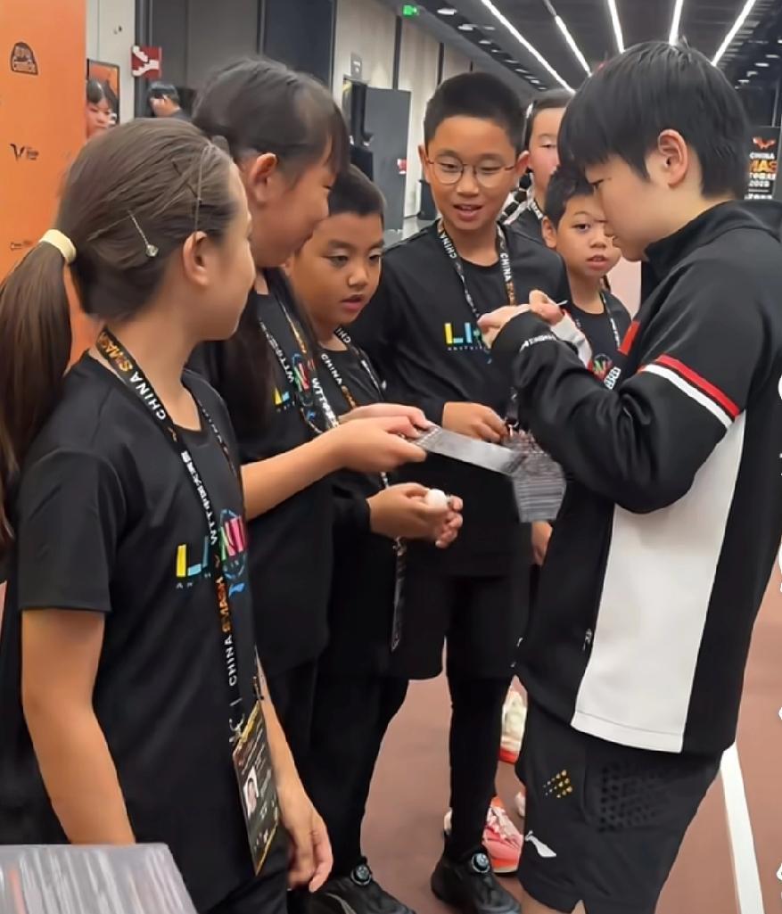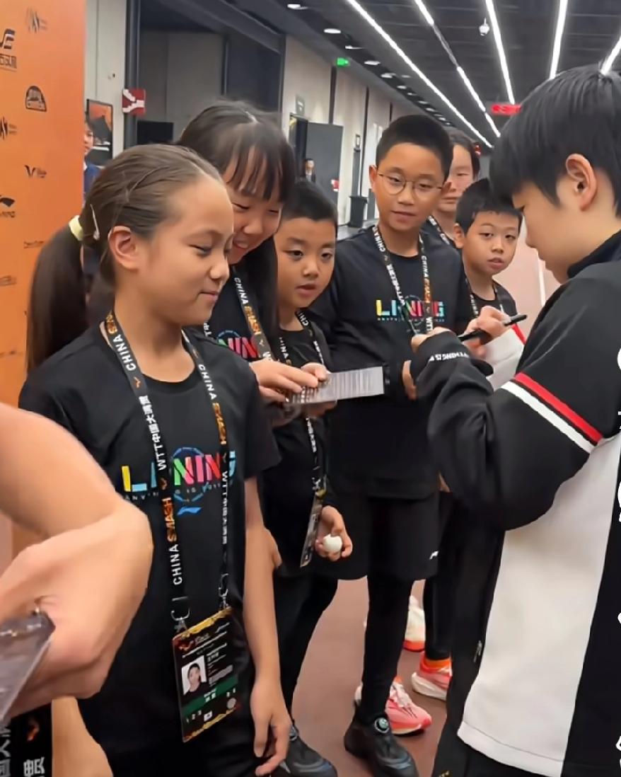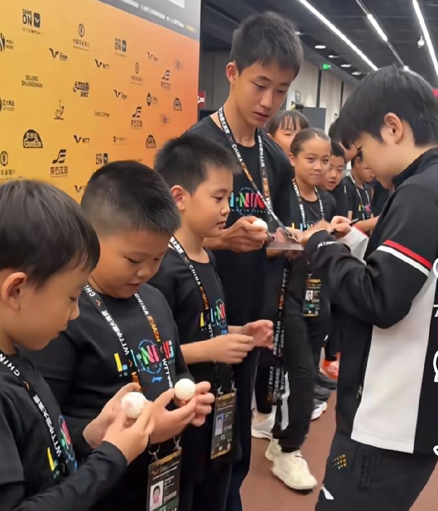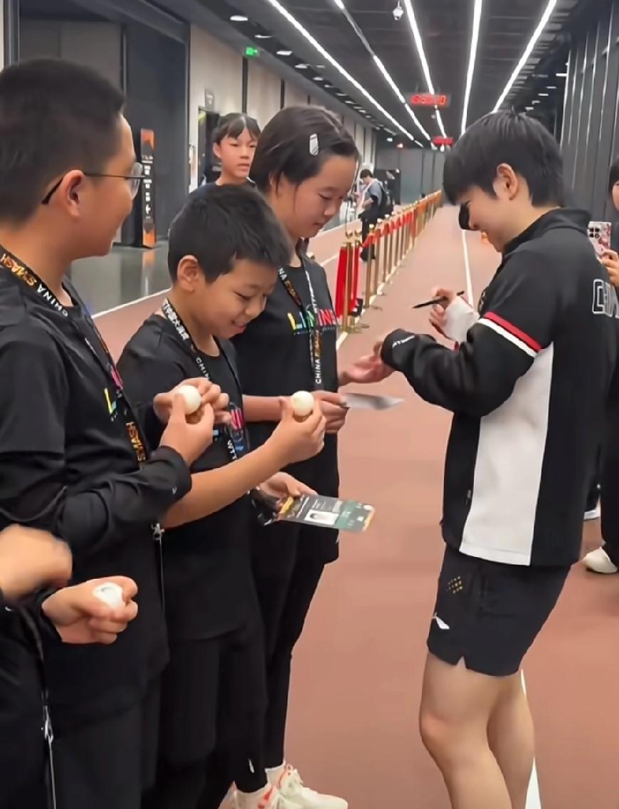 下班后的孙颖莎也还是有好多任务等着她,꒰* ॢꈍ◡ꈍ ॢ꒱✿唔 与小球童们合影, 给小球童们签名。 羡慕这些小球童们, 可以跟莎莎姐姐离得这么近, 也都是有人脉的啊。 看他们还很有秩序, 排成一排等着,哈哈, 别挤,都有份哈。