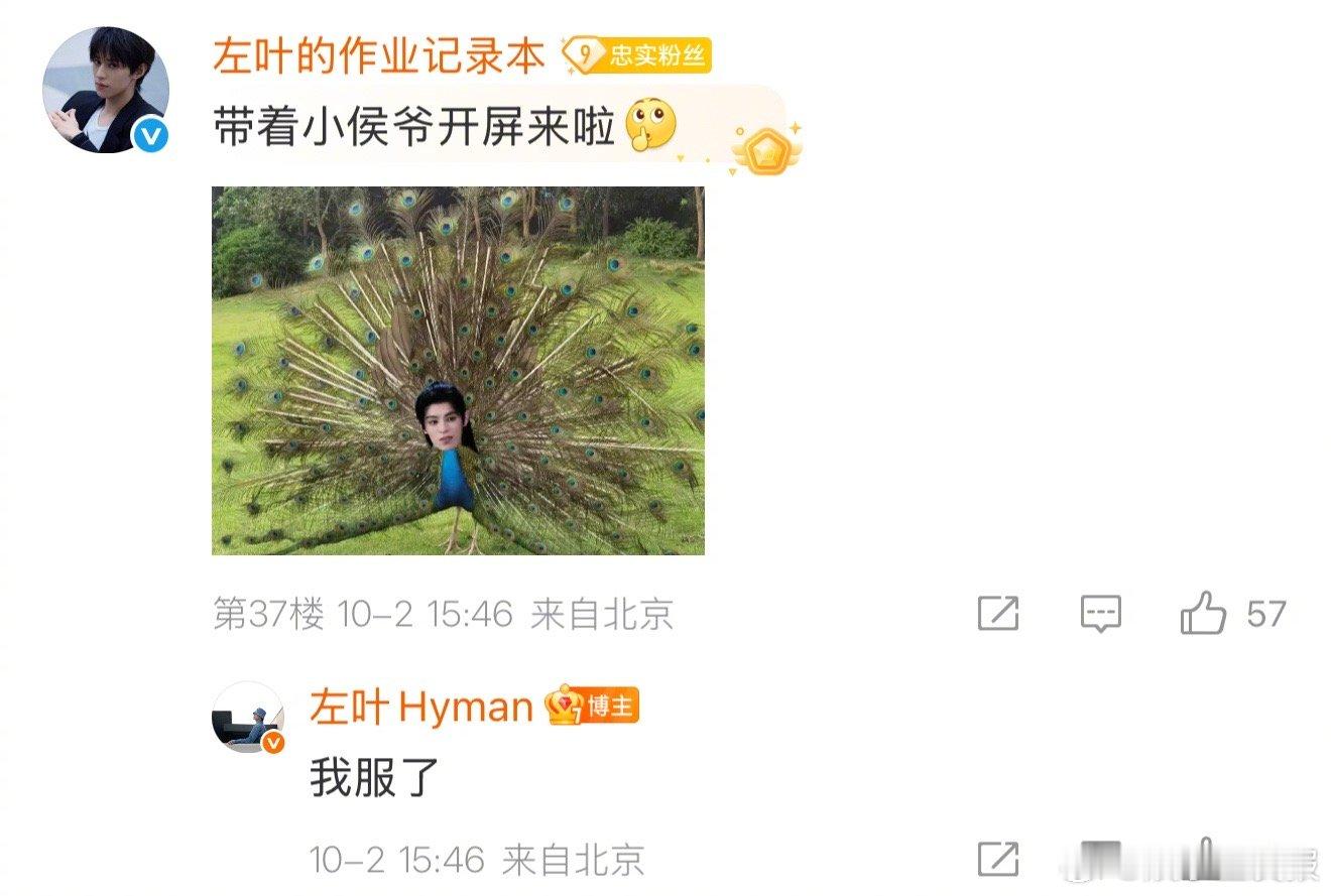 左叶动物园和孔雀开屏battle更新动物园游记,在动物园和孔雀互相开屏battle,幻视他在新剧《一笑随歌》里慕容曜开屏,慕容曜是左叶本色出演吧?