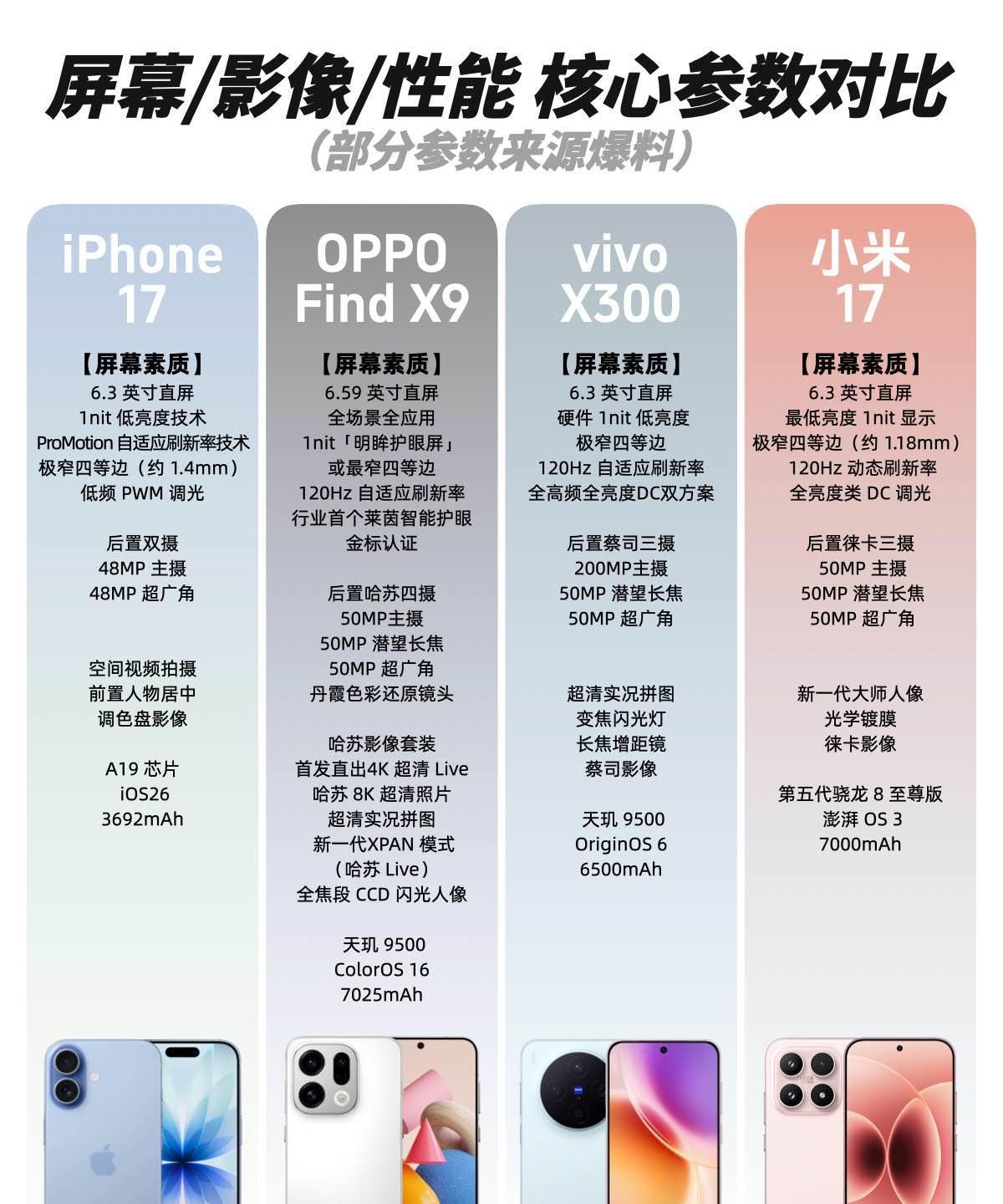 一篇看懂|2025下半年标准版旗舰怎么选 iPhone 17标准版今年大的升级就是屏幕了,终于迎来了高刷屏,苹果老用户打算换机的完全可以冲,这款估计会是新的苹果钉子户神机 小米17今年是常规升级,徕卡三摄影像实力不错,第二代骁龙8至尊版的性能也可圈可点,米家生态用户首选。vivo X300影像升级幅度很大,2亿像素主摄、潜望长焦素质都很高 OPPO Find X9有重量级提升,是标准款里唯一四摄的,丹霞色彩还原镜头+哈苏影像成片色彩出众,还支持哈苏8K超清照片、4K超清Live图等功能,更适合喜欢拍照的用户 具体哪款更值得入手,还得看大家自己的喜好和需求,我个人比较看好OPPO Find X9,主要是它影像体验很接近Ultra级别,ColorOS16、明眸护眼屏等配置日常使用更舒服,电池还是最大的,整体更全面,大家觉得哪款更让你心动呢? #OPPOFindX9系列# #iPhone17# #vivoX300# #小米17#