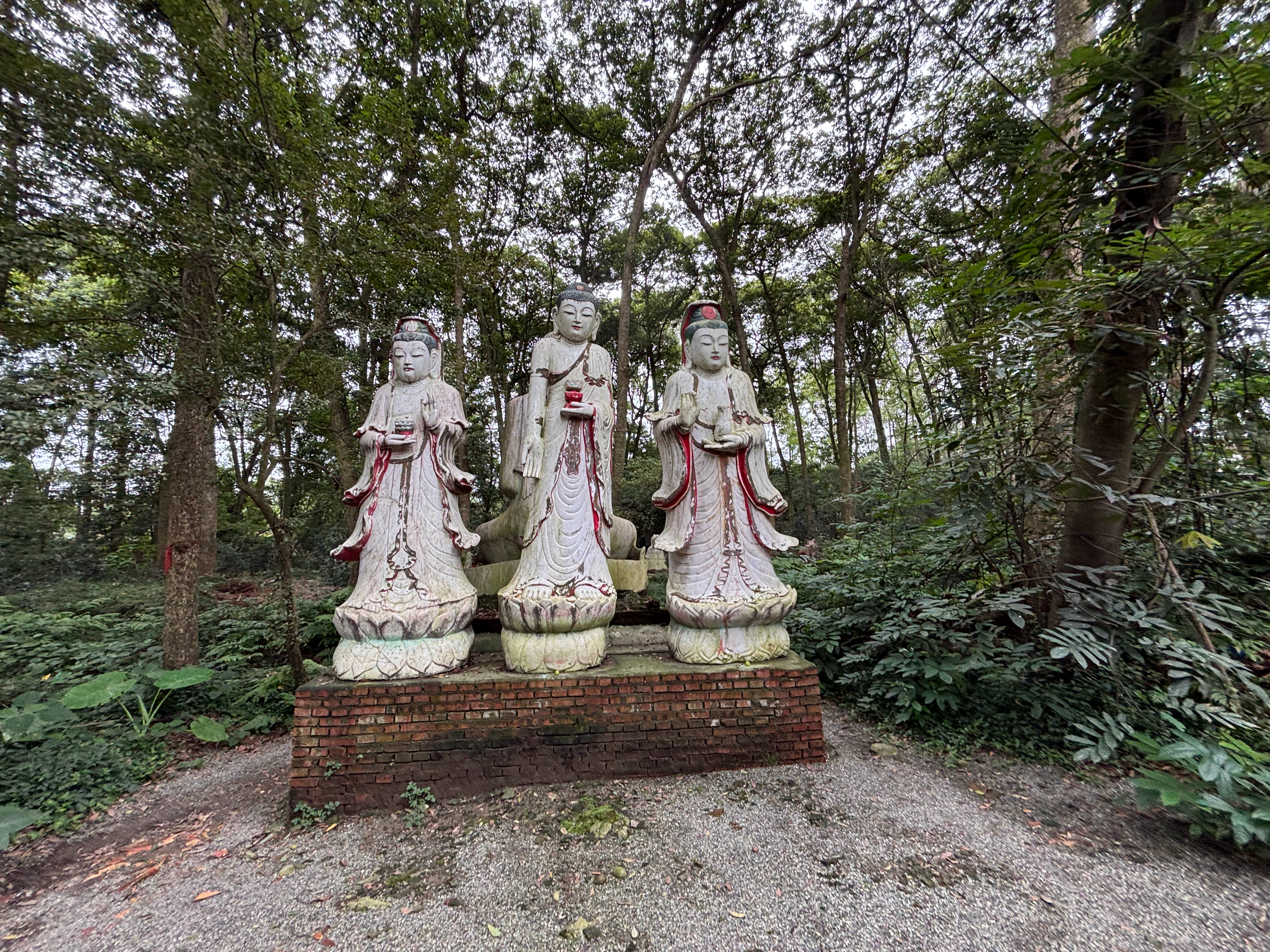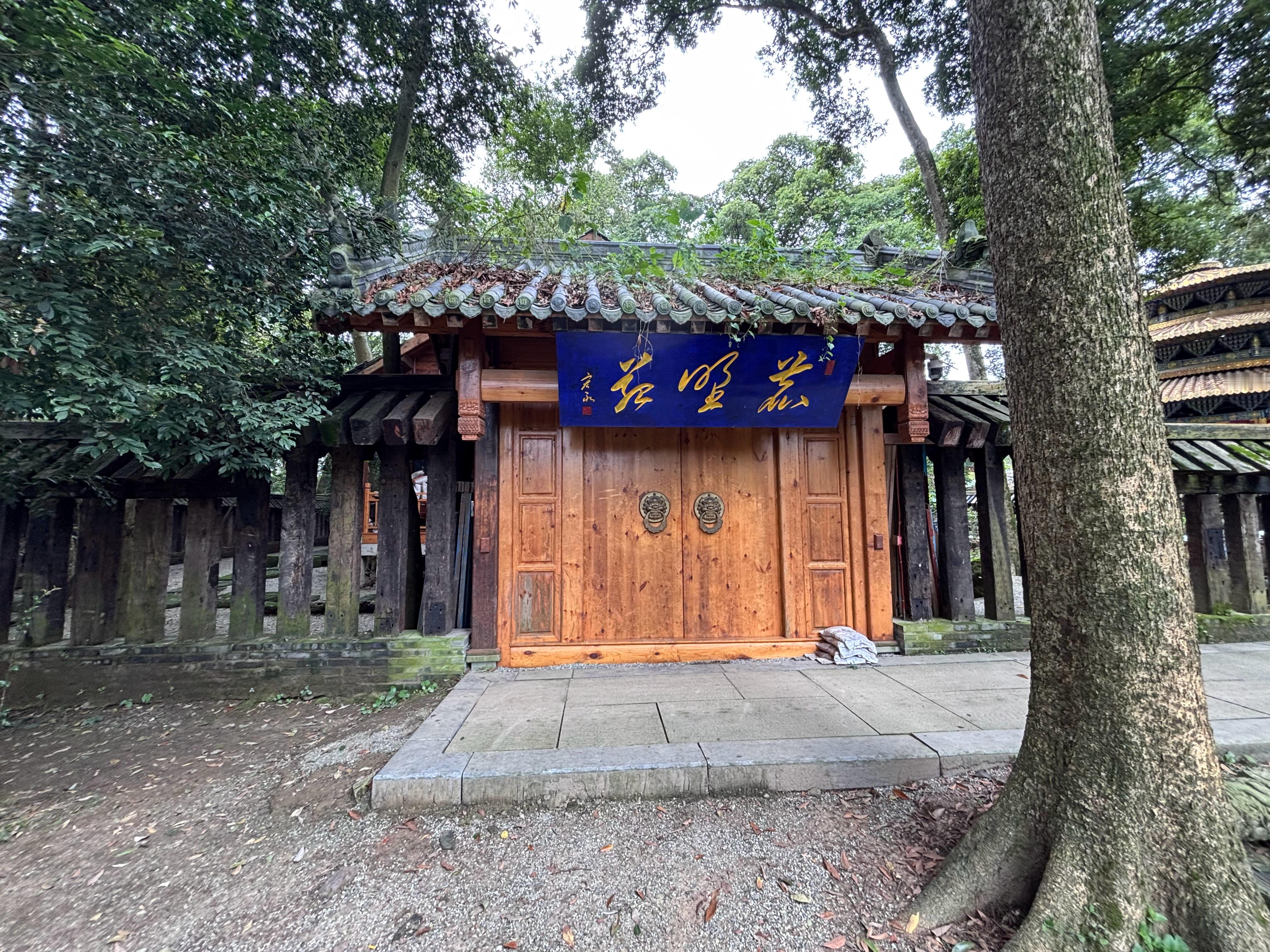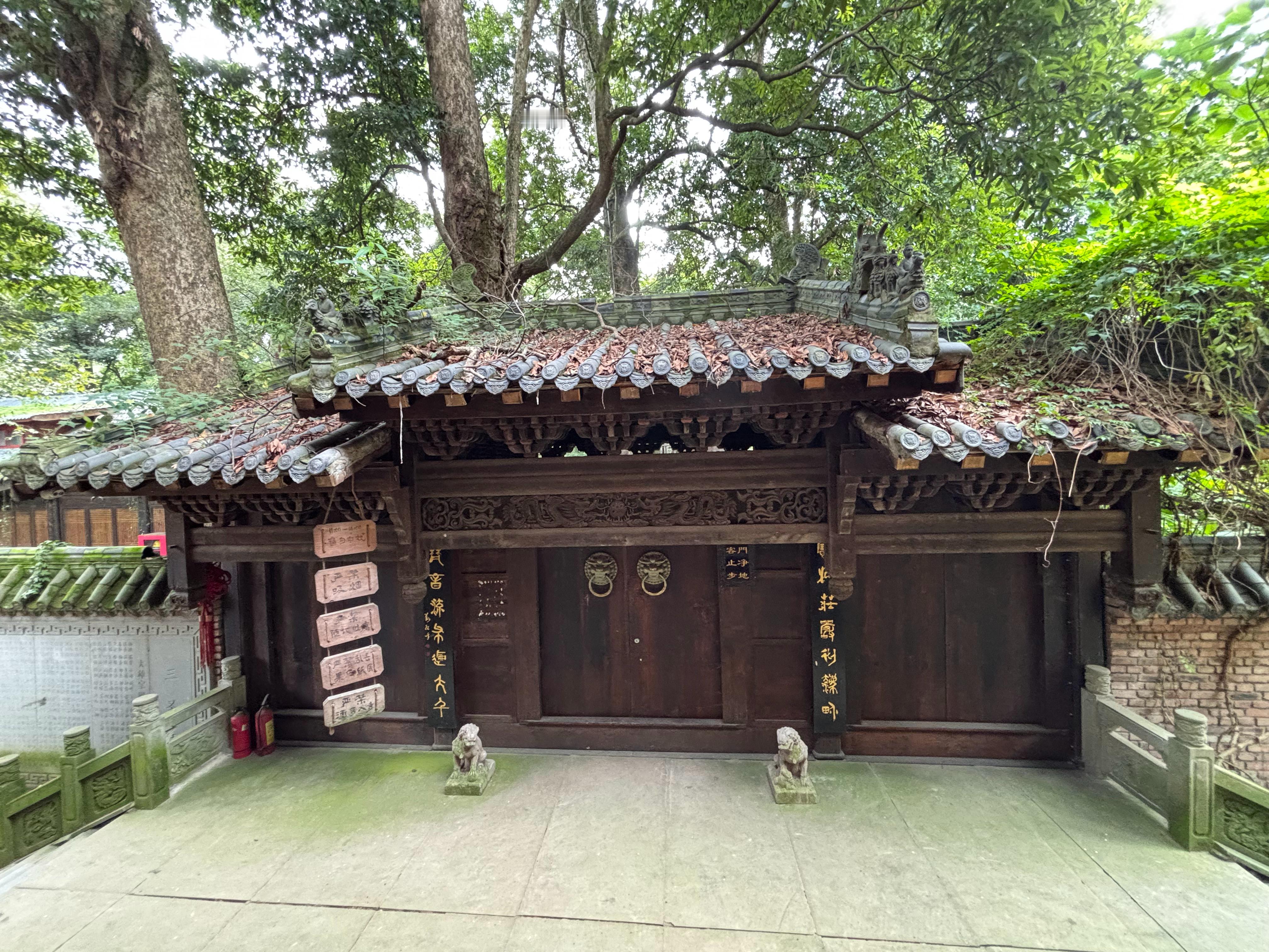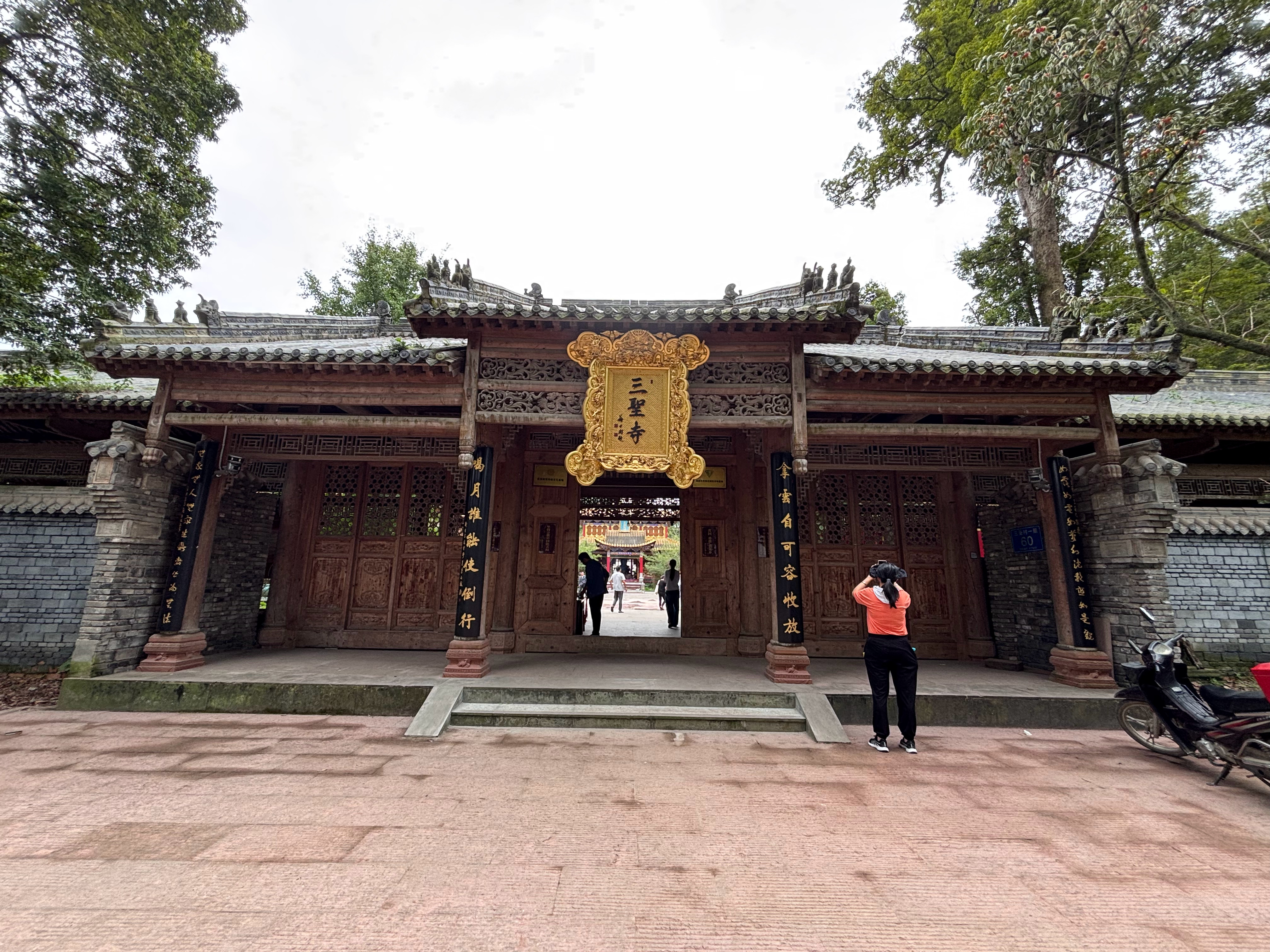 三圣寺,位于彭州境内,距灌县很近。寺庙历史悠久,据传乃三国时张松的住宅,后建为寺。该寺中养有梅花鹿,且有一日式风格建筑,状与日本奈良公园有名的古寺大华严寺同。寺中古树楠木多,寺旁一棵楠木树标注已有1500余年历史,传为张松夫妇所栽,挺拔苍郁,千年之树伴千年之寺,仿佛闹市中一静地。