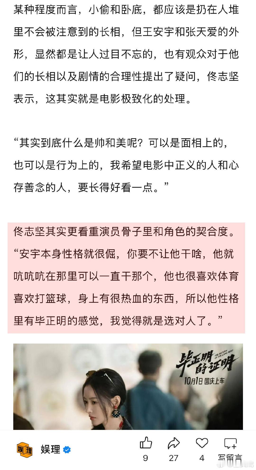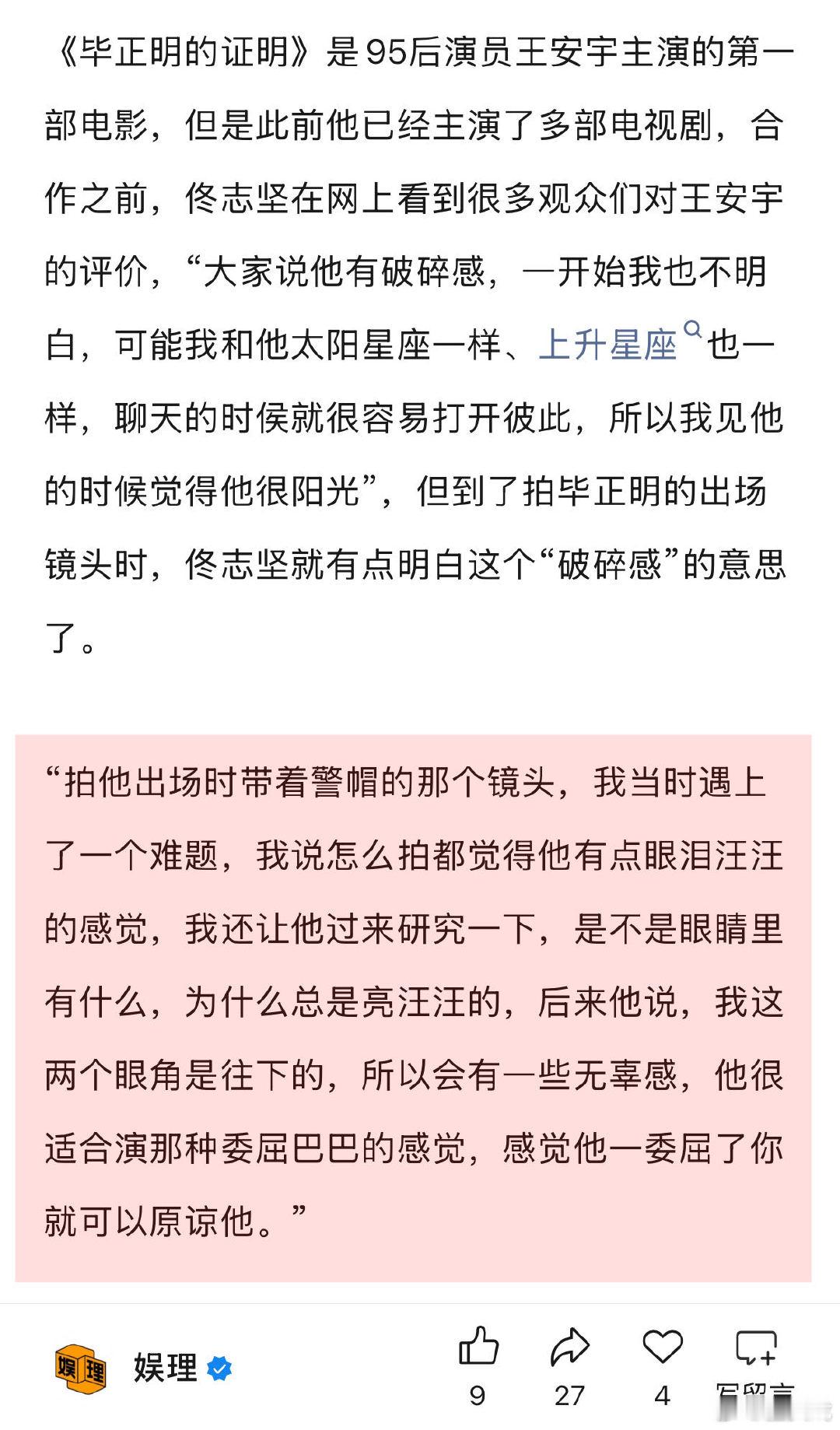 导演说选王安宇是选对人了 毕正明的导演谈王安宇的破碎感 谈及选角,《毕正明的证明》导演佟志坚称他更看重演员骨子里和角色的契合度。“王安宇本身性格就很倔,你要不让他干啥,他就在那里可以一直干那个,他也很喜欢体育喜欢打篮球,身上有很热血的东西,他性格里有毕正明的感觉,我觉得就是选对人了。”娱理独家↓