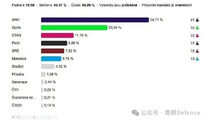 “捷克川普”安德烈·巴比什领导的民粹主义中左翼政党“不满公民行动”ANO以35%的得票率获胜,获得了81个席位,现任中右翼联盟失去了多数席位,但要想组阁,ANO就必须与两个极右翼反对党派组成联盟,预计新内阁将采取温和政策,继续保持亲北约立场,但不会再像现在这样积极支持乌克兰。