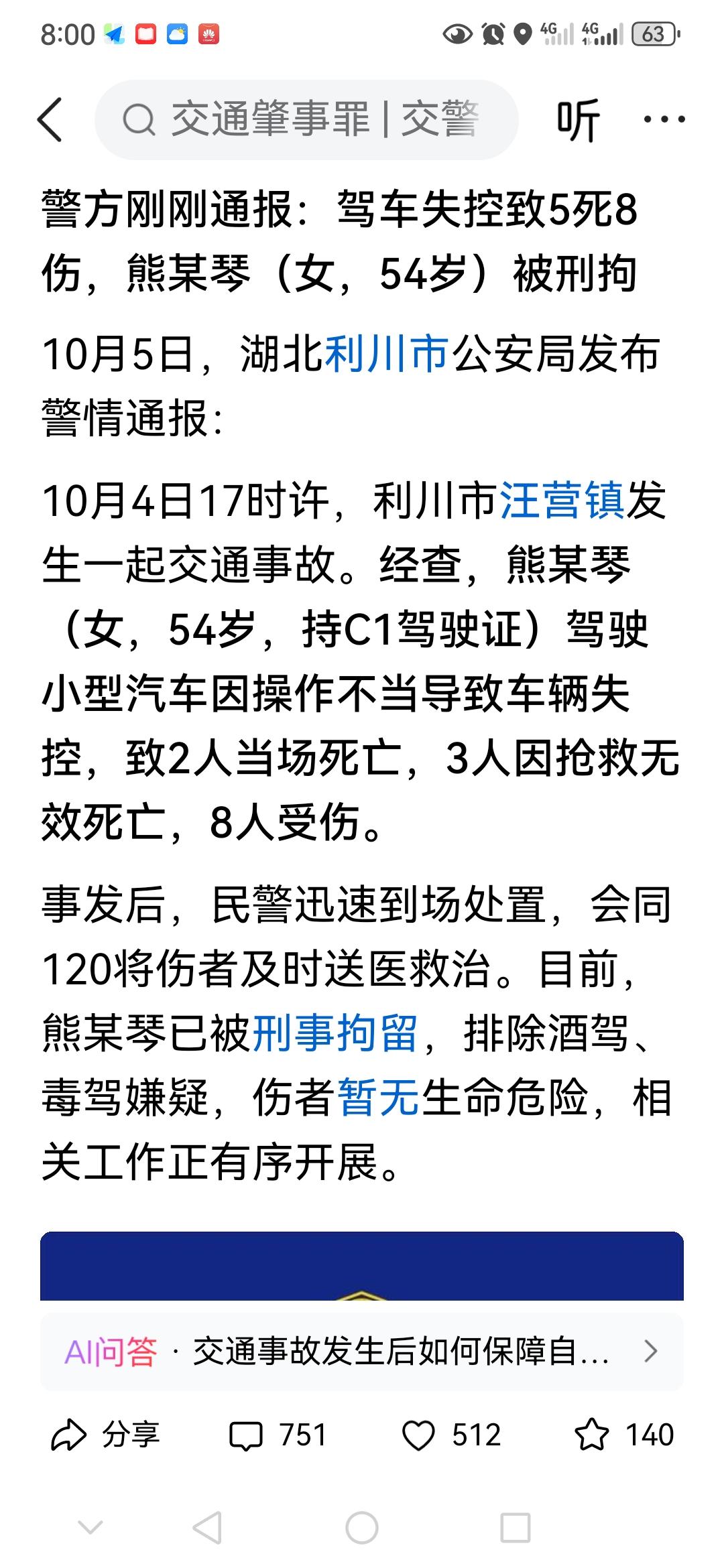 又是女司机! 一句轻飘飘的车辆失控,就断送了5个鲜活的生命!外加8个重残,简直是漠视生命,无法无天! 我以为无论什么原因,导致的这起重大交通事故,当事人都应该执行枪毙并带民事赔偿! 但交通法规可不这么认为,只要不涉嫌故意,都法外开恩,不会死,甚至几年就回家了,这就是交通法规的弊端,看来法律法规的完善任重道远!