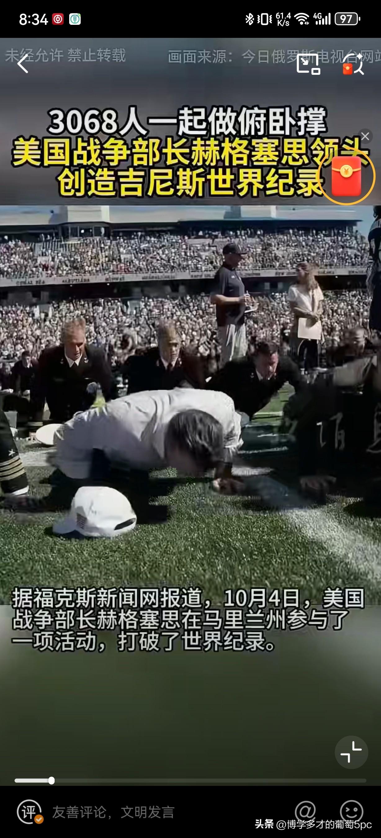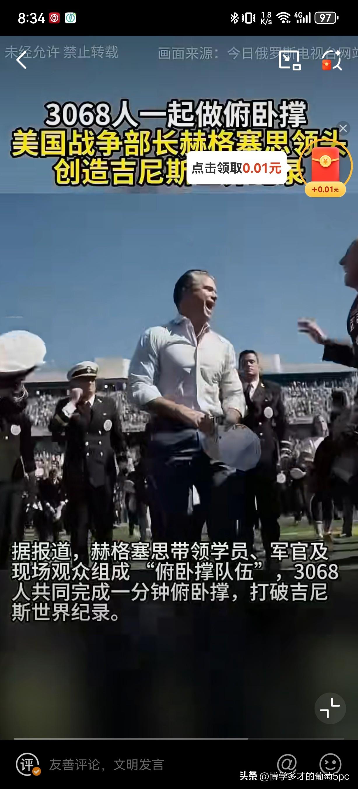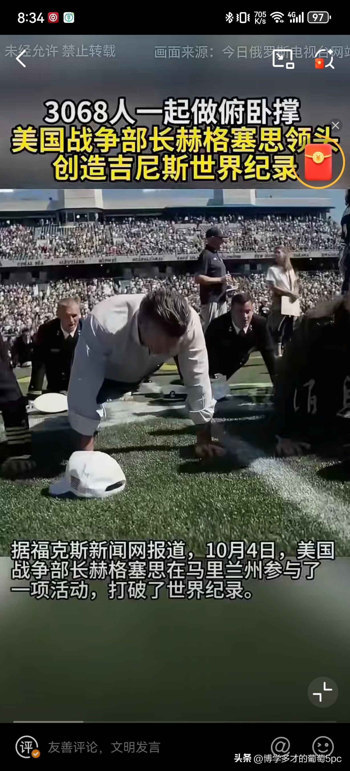 10月4日,美国战争部长赫格塞思在马里兰州带领学员、军官及现场观众共3068人,共同完成一分钟俯卧撑,创造了吉尼斯世界纪录。 视频中,赫格塞思身处人群中带头做俯卧撑,完成后起身与身边人员击掌庆祝。对此,《华尔街日报》讽刺称,五角大楼在追求高科技的同时,赫格塞思却仍专注于健身类的活动。 当天,赫格赛斯还在海军学院与学员互动,现场人员众多,场面热闹,场面像传销演讲。