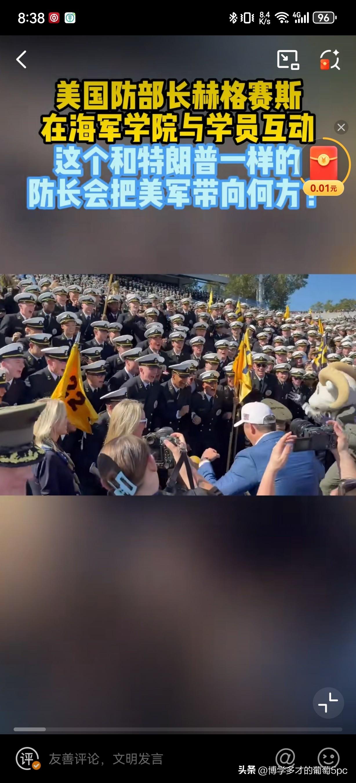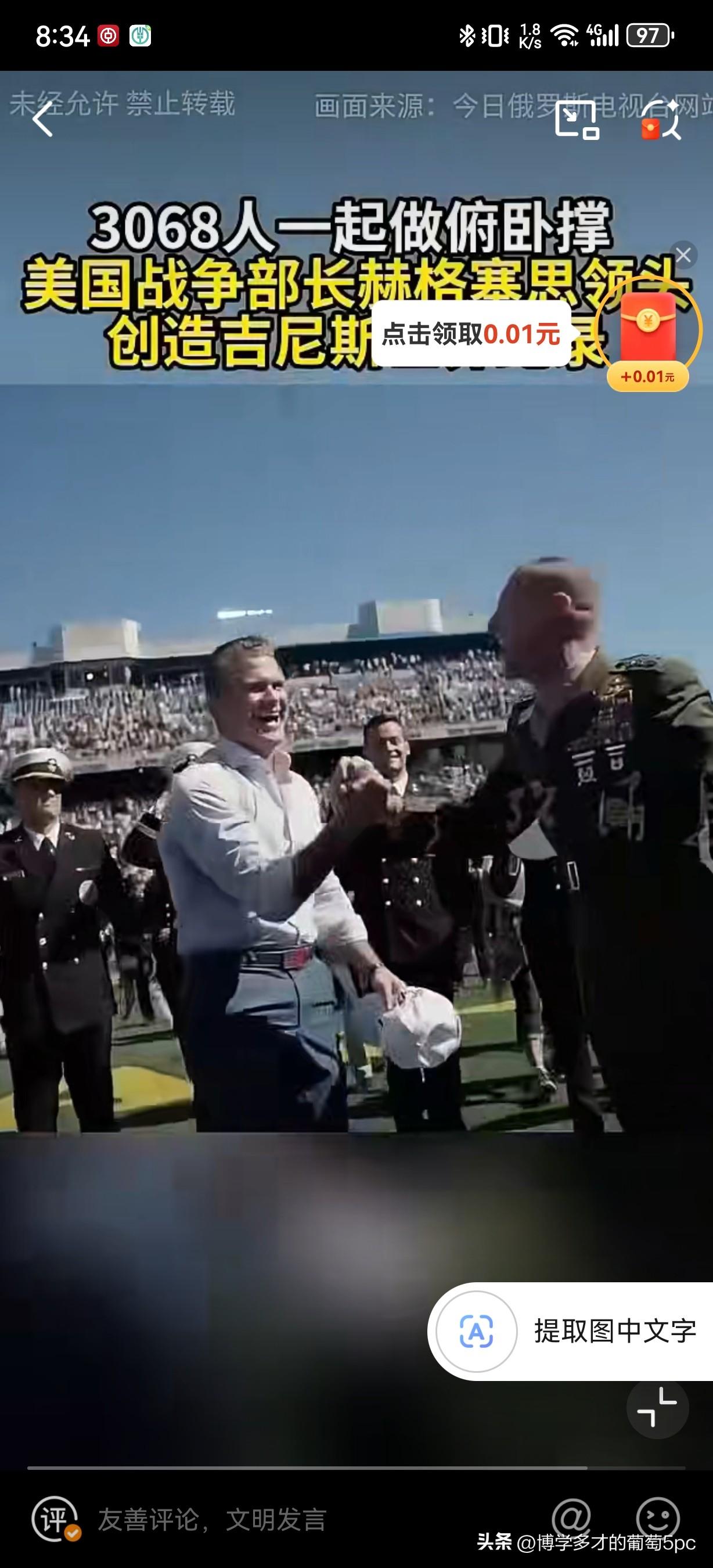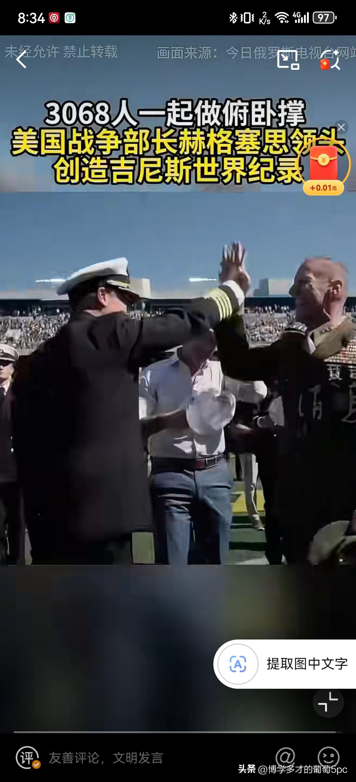 10月4日,美国战争部长赫格塞思在马里兰州带领学员、军官及现场观众共3068人,共同完成一分钟俯卧撑,创造了吉尼斯世界纪录。 视频中,赫格塞思身处人群中带头做俯卧撑,完成后起身与身边人员击掌庆祝。对此,《华尔街日报》讽刺称,五角大楼在追求高科技的同时,赫格塞思却仍专注于健身类的活动。 当天,赫格赛斯还在海军学院与学员互动,现场人员众多,场面热闹,场面像传销演讲。