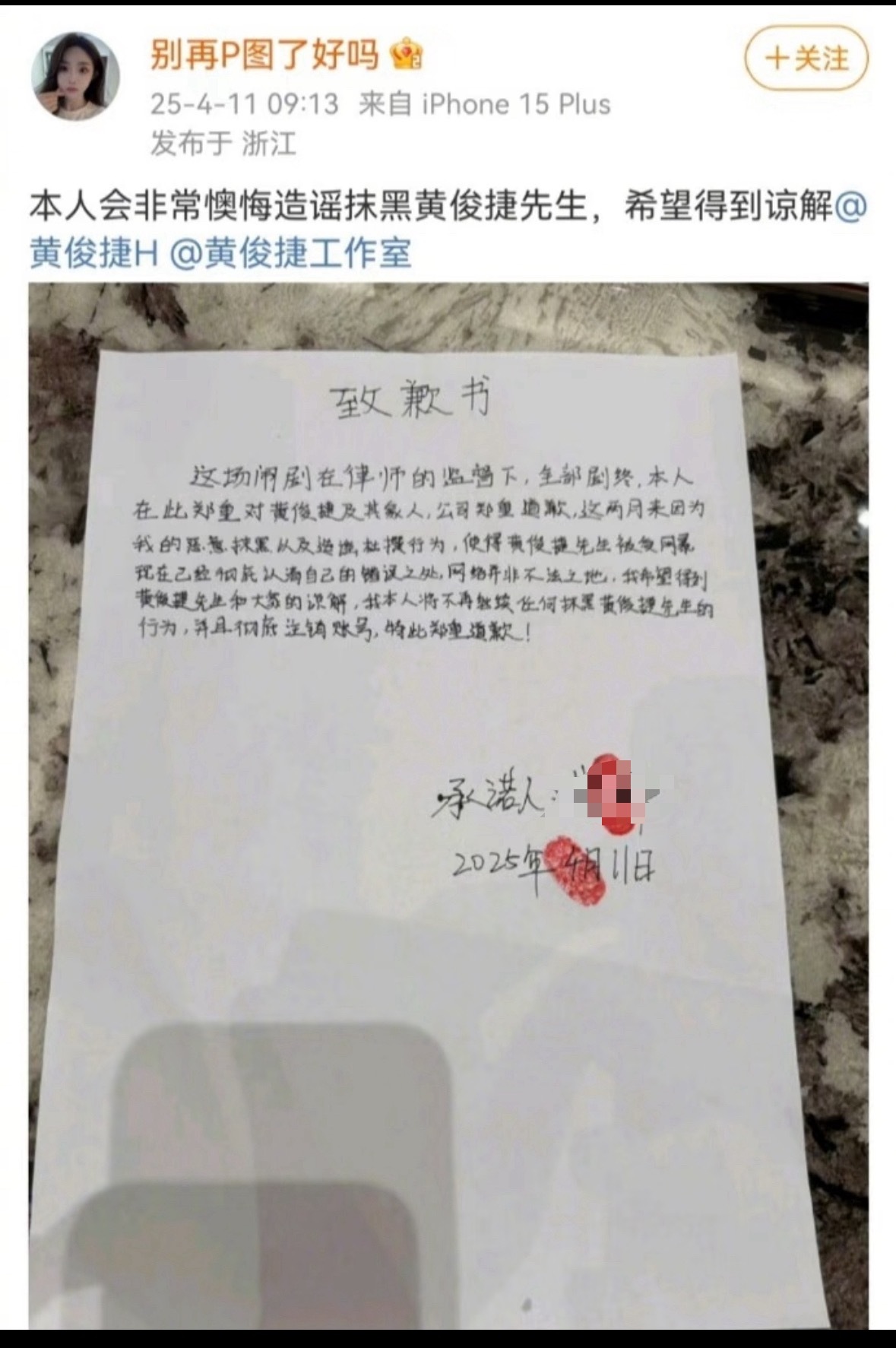 p图姐喊话黄俊捷没记错的话,P图姐4.11不是手写道歉信给黄俊捷道歉了吗?互联网