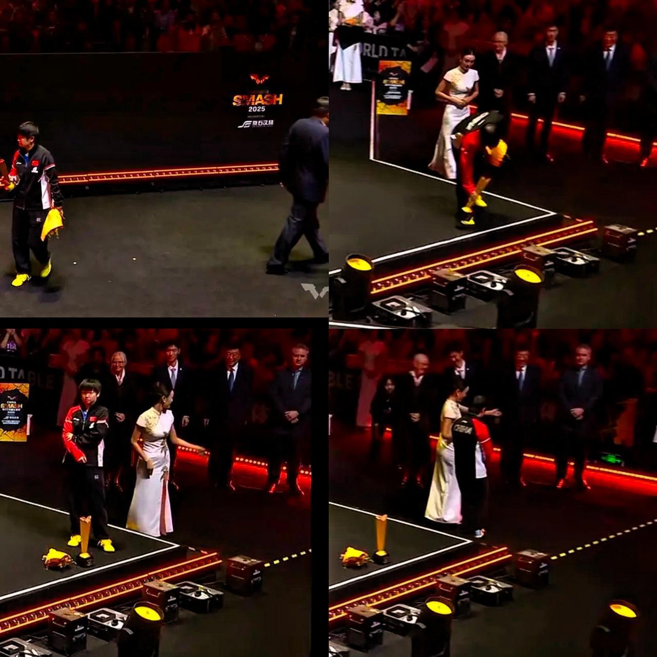 莎莎这次可“闹”了个小插曲! 女单颁奖仪式上,亚军莎莎颁奖后,在台边等冠军曼玉。估计奖杯太重,她就把奖杯和鲜花放地上,空手站着。结果礼仪小姐指引她退到台下,她就把奖杯和鲜花留在台上自己下去了。 有人可能觉得莎莎这举动有点迷糊,可在我看来,这恰恰体现出她纯粹的一面。对她来说,打球才是重中之重,奖杯似乎只是附属品。她全身心投入赛场,享受比赛的过程,荣誉反而没那么在意。 你们觉得莎莎这行为是可爱还是太“心大”啦?快来评论区聊聊你们的看法呗!