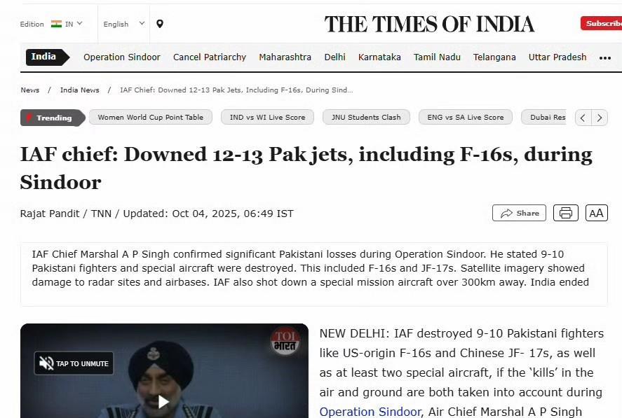 印度57空战这个坎是过不去了,印媒报道,印度空军司令宣称,在辛杜尔战役中,击落了12-13架巴基斯坦战斗机,包括F-16。 10月4日,时隔五个月,印度又开始回顾巴以冲突,为了找回尊严,现在说印度击毁了包括美国和中国在内的12-13架高科技战机,有F16和JF17。 但是这个空军司令没有拿出任何证据,没有照片,没有后台数据,没有第三方证明。当时巴基斯坦击落印度阵风的时候,甚至连飞行员就诊的医院都说了出来,印度也一直没有承认。 不过这篇报道大概率也是说给印度人听的,记者就这个报道询问巴基斯坦发言人,结果巴基斯坦方面懒得评价。 空战的时候不说,事情过去了这么久,又拿出来说事,印度真是个让人捉摸不透的国家。