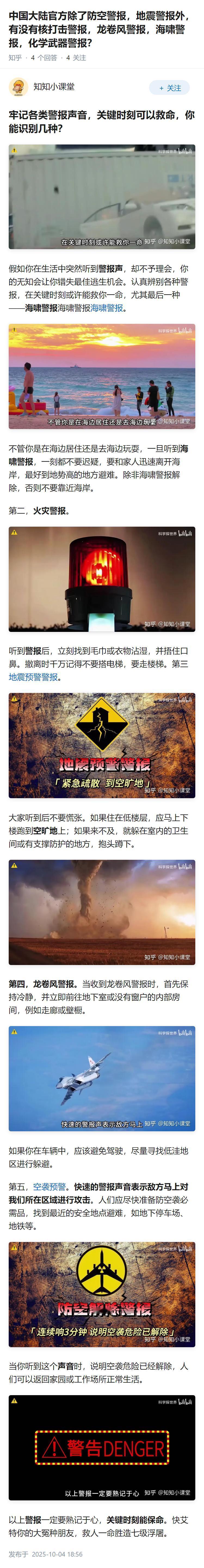 中国大陆官方除了防空警报,地震警报外,有没有核打击警报,龙卷风警报,海啸警报,化学武器警报?