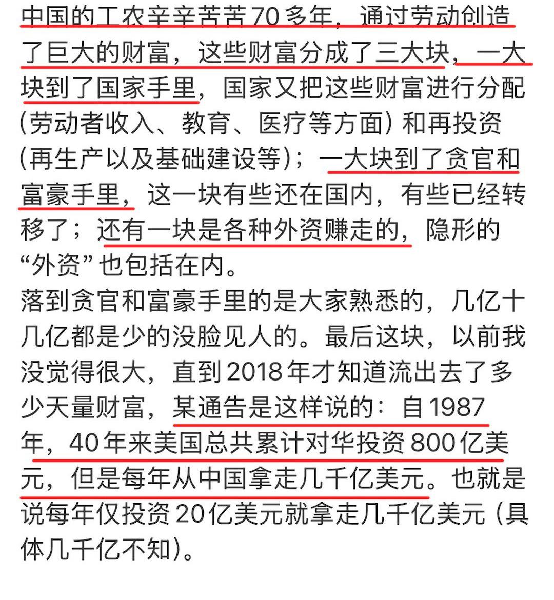 【琅河财经】个人对李小加在米尔肯的发言进行补充和纠正一下,主要有几点:其一是三四十年以来财富的流向,这里面要补充上外资和隐形外资的收益,这一块大部分已经流出或被转移走了,不管是合法的还是不合法,图一。这一块的总量是长期以来没有得到各方重视和研究的,也很少有学者和报道提及,但个人认为金额是非常庞大的,我也没有具体的数字,仅是从侧面的一些报道中的推测,如图二。 其二是50%的流向国家掌握的财富,这个说法很容易引起误解,不提50%的准确性,流向国家的财富主要是税收和国有资产利润,但这一块并不是被国家占有了,而是通过初次分配和再分配已经流向民众和社会了,比如国家对基础设施建设、教育医疗卫生、国防、科技研发等的投资建设,还有一部分是再次投入生产、扩大工业化规模了。这些肯定都是正事,是用在了国计民生上。 其三,不仅要对国家掌握的财富进行更合理的再分配,还要针对社会资本掌握的财富进行更合理的分配和再分配。针对后者主要是从提高最低劳动工资入手,将整个社会的劳动力报酬,尤其底层劳动者的收入水平提高上去,严格落实法定的工作时长,对加班进行严格监管,加班工资要翻倍落实,设置最高劳动时间强度,等等,既是对初次分配的调整,也是治理内卷的必要措施之一。