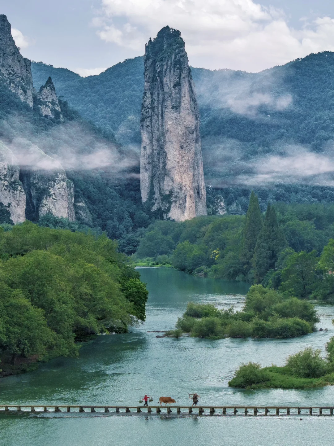 是《仙剑奇侠传》《天龙八部》《与凤行》得取景地,云雾缭绕,老人牵着牛从小桥上走过,每天都有牵牛的定时表演,远处的鼎湖峰高耸入云