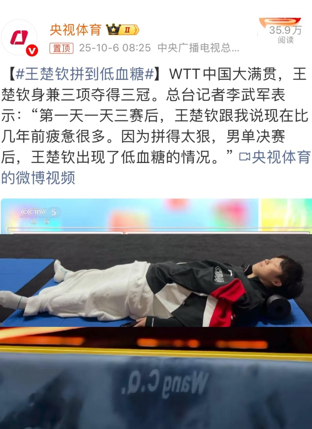 央视报道了昨天王楚钦半决赛后, 一个人盖着自己的大毛巾, 在场的休息凳上睡着的画面, 手里还拿着自己的手机。 说实话看到这样情景真的让人心疼, 当妈妈的看到孩子这样真的会止不住的流眼泪啊。 以前王楚钦从来没有说过自己累, 这一次兼三项肉眼可见地累啊, 也感觉到整个人都瘦了。 如果可能下次真的不希望楚钦再兼三项了,꒰* ॢꈍ◡ꈍ ॢ꒱✿唔 虽然我们只是看球的, 但是太多的消耗对运动员意味着什么, 我们都知道, 请一定要珍惜王楚钦。