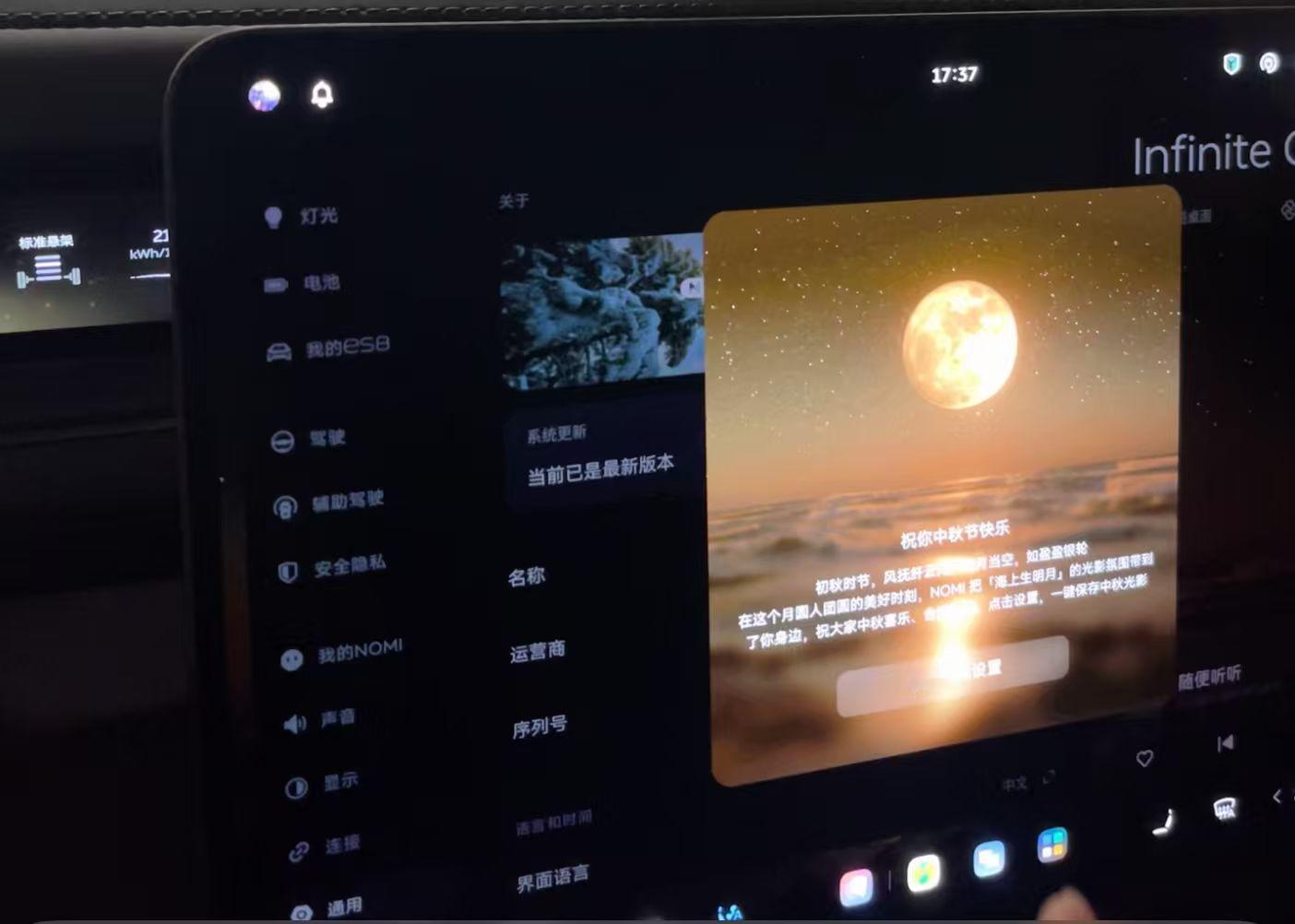 说实话,我之所以很喜欢蔚来这家公司,其中很重要的一点,是蔚来真的会把情感带入到车主的日常用车当中,不仅每年生日那天会有生日祝福,春节时候会有春节祝福。在今天,中秋节,蔚来也送来了中秋的祝福。这次在全新ES8上,不仅是有中秋的主题,甚至还有独属于车主的浪漫时刻——投影赏月。