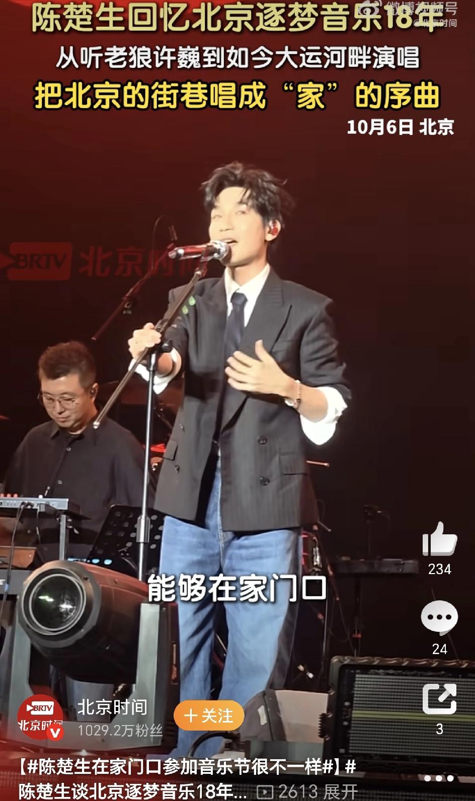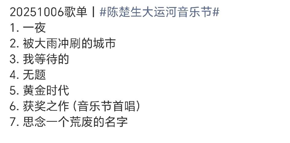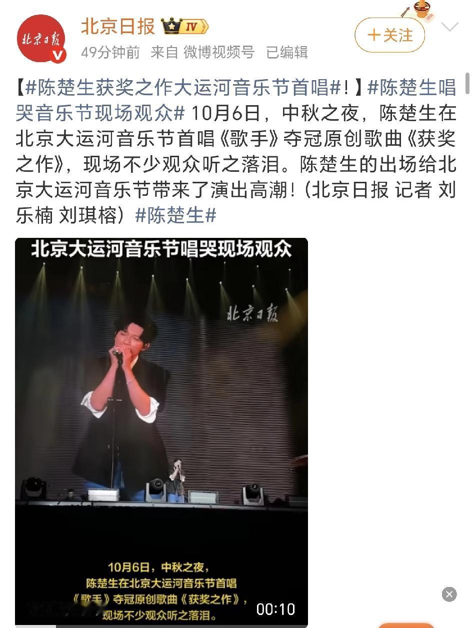 陈楚生北京大运河音乐节歌单, 《获奖之作》音乐节首唱! 今晚好特别哦,湖南卫视中秋晚会唱了《远山如昨》和《获奖之夜》,在大运河现场又唱了《获奖之夜》,这首歌太有意义了! 《思念一个荒废的名字》国庆期间首次回归,他对北京还是有些特殊的感情的,已经生活了18年,他的第三故乡了吧,落地生根,这就是家! 北京官方各大媒体都发了文,盛赞陈楚生的出场给大运河音乐节带来了 演出高潮[赞]!陈楚生
