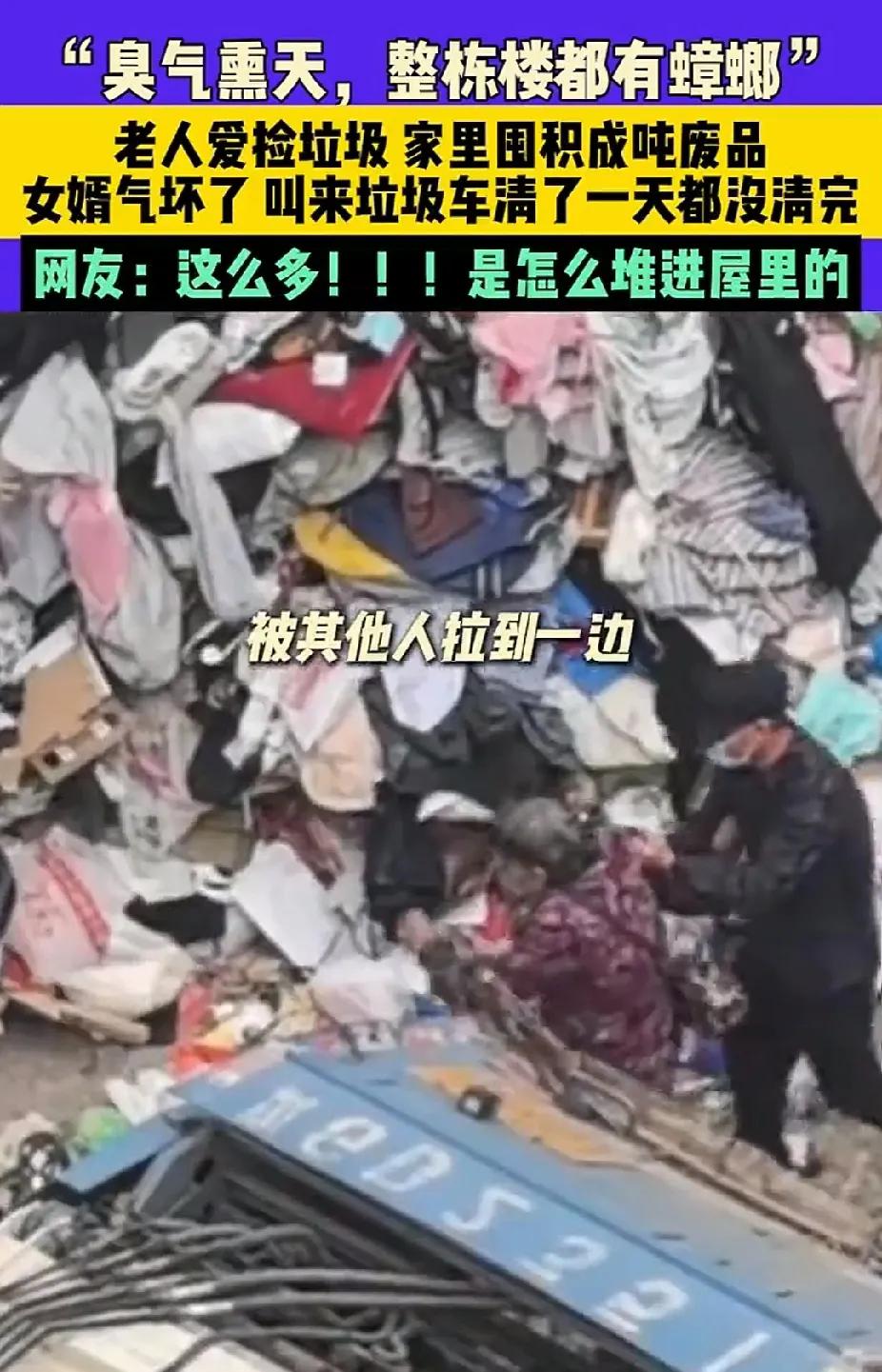 “没苦硬吃型!”河北一老人爱捡垃圾,家里已囤下成吨废品,女婿气炸了,叫来垃圾车清理一整天,邻居苦不堪言:臭气熏天,整栋楼都有蟑螂。 许多老人都喜欢“没苦硬吃”,明明家里条件还可以,不需要出去捡废品。 可有的老人执意不听,只要一出门,无论看见什么都要往家拎,比如废旧衣物、空油瓶、纸板子、饮料瓶…… 近日,河北一名70多岁的老人将捡来的垃圾,全部堆放在仅60多平的家中,高度快到房顶,形成了一座山。 据邻居透露,整栋楼里臭气熏天,蟑螂成堆四处乱爬,让左邻右舍苦不堪言。 在老人的家里,成捆旧报纸快堆到天花板,塑料瓶塞满每个角落,废弃家电叠成危墙,仅留一人侧身通过的窄道,几乎没办法过人。 收到好多邻居投诉的女婿气炸了,近年来,与岳母捡废品的拉锯战,几乎耗尽了他的所有耐心。 趁着国庆大假,女婿叫来垃圾清运车,当第一袋旧衣服从三楼窗口被扔下一楼时,伴随着的灰尘令人窒息。 引来许多邻居在楼下拍照围观,有人拍手称快:“早该清了!整栋楼都是蟑螂。” “夏天根本不敢开窗。”一位大妈摇头,“那味道,熏得人头疼。” 清理工作持续了一整天,垃圾车来回搬运了整整3趟,当清理出一小块位置时,雪白的墙面已经积满霉菌。 看见自己多年的“战果”被清理,堆成一座山,老人忍不住想冲进垃圾堆抢回一些,“那些纸箱还能卖钱!” 每次,都被女婿将她按回原位,不让她再往回捡。 “理解不了,真的理解不了。” 女婿表示,老人的退休金和子女平时孝敬的钱,完全够花,不知道为什么总要捡垃圾回去? 许多老人的童年记忆里缺吃少喝,养成了凡是看见能卖钱的东西,就总想着捡回去。 原来这些老人童年的“吃苦”经历,刻进了他们的基因,在他们眼中,这些不是垃圾。 生锈的电饭煲,洗洗修修还能用,那些废弃塑料瓶,油桶子,是可以卖掉换成钱,每斤5毛钱至1元钱。 纸皮子,纸板子,每斤5毛钱至1元钱。 我为什么知道这此?因为我爷爷就爱往家捡垃圾,已经90岁高龄,一个人独居三室一厅。 每天,爷爷都要骑着自行车出门捡几个小时废品,连别人不要的旧毛巾、旧衣服、旧鞋子、旧包包…… 几乎什么都要往家捡,夏天真的臭气熏天,说又说不听,只好由着他去捡,我宁可租房住,也不敢和他住一起。 许多人都无法理解,老人们为什么舍不得扔掉早已过时的东西? 其实那是来自于对匮乏时代最深刻的恐惧,是对“说不定哪天能用上”这种可能性的执着。 这种偏执,被心理学家称之为“囤积症”,从某种程度上来说,是老人面对衰老的无力感。 当老人腿脚不灵了,记性变差了,儿女不再需要他的意见后,这些瓶瓶罐罐,便成为陪伴他们的“伙伴”。 家,从来不应该是仓库,但如何清空仓库?又不伤及老人的心,需要子女付出比清理垃圾更多的耐心和智慧。 在物质不再匮乏的今天,老一辈的心理“匮乏感”,需要比清运车更温柔的方式来安放。 愿天下的老人,都能安度晚年,不要再没苦硬吃,好好享受每一天吧! 欢迎交流,你怎么看老人爱捡垃圾回家?