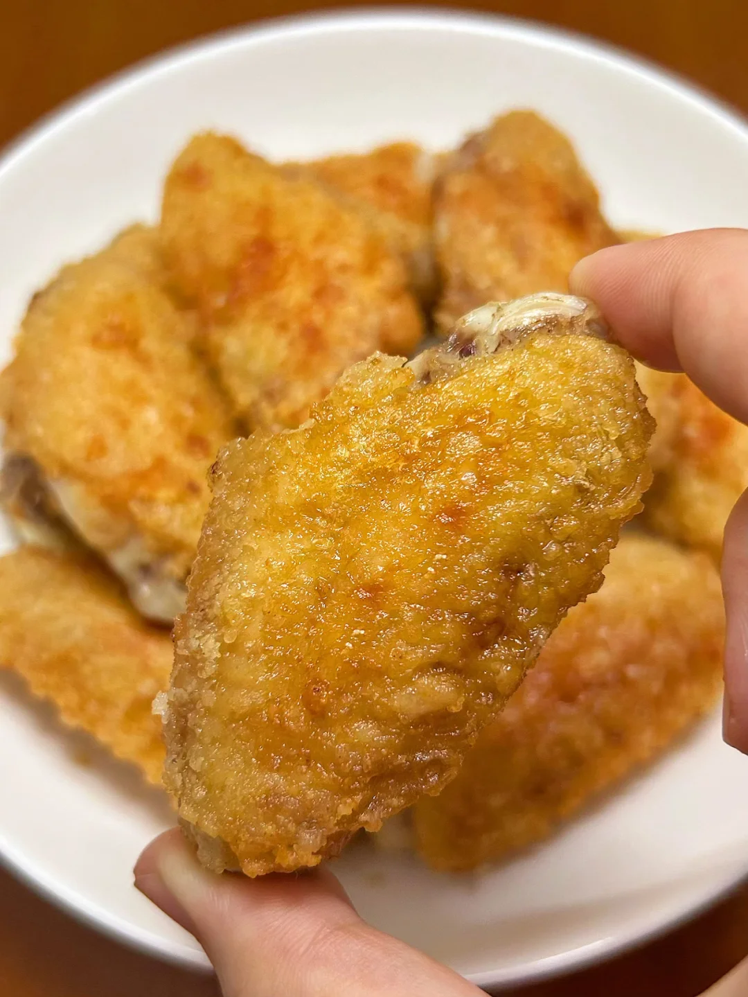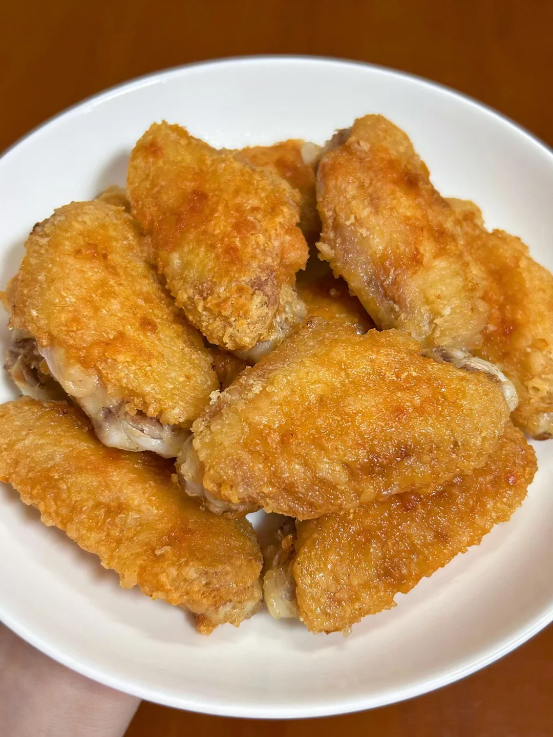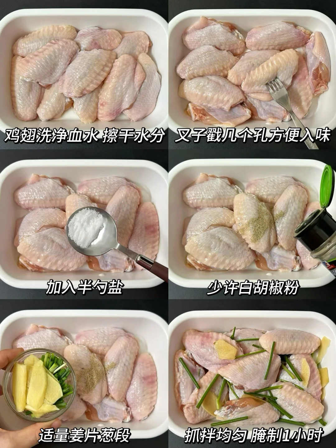 谁懂啊,我要吹爆这个鸡翅配方❗️没有多余的调料,做法超级超级简单❗️表皮酥脆,里面鲜嫩多汁,咸香咸香的蘸上辣椒面味道更绝!![偷笑R][偷笑R]我一口气吃了半盘,好吃得连骨头都不想放过~ ✅食材:鸡中翅10只,葱姜适量 ✅做法: 1️⃣鸡翅洗净血水,擦干水分,用叉子戳几个孔方便入味。参考图片腌1小时,放入2勺玉米淀粉抓匀 2️⃣油热下鸡翅,皮厚一面朝底先煎,煎至金黄再翻面,筷子插入没冒血水即熟透🔥中小火8-10分钟